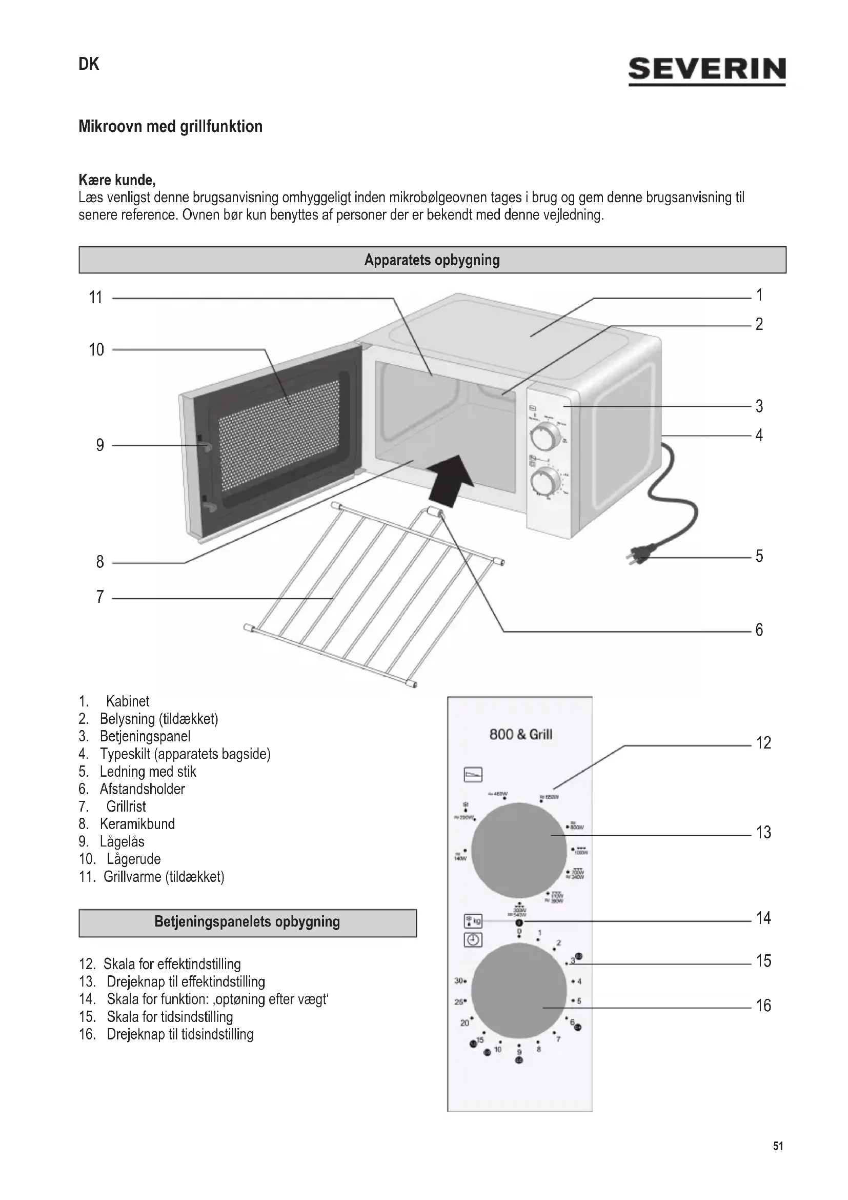 Advarsel: Apparatets ydre ader kan blive varme under brug. Der er også fare for at damp kan udledes gennem ventilationsrillerne: Fare for skoldning. ∙ Lad først apparatet køle tilstrækkeligt af, inden det transporteres. ∙ Lad ikke apparatet eller dets ledning komme i berøring med varme overader eller komme i kontakt med andre varmekilder. ∙ Lad ikke ledningen hænge løst og hold den væk fra alle varme dele. ∙ Hvis apparatet ikke holdes ordentligt rent, kan det forårsage forringelse af overadernes kvalitet, hvilket kan medføre mulig forkortelse af apparatets levetid, såvel som mulig risiko for brugerens sikkerhed. Lågens tætninger, tilberedningsrummet med keramikbund og de tilstødende dele rengøres med en fugtig klud efter hver brug. Detaljeret information om rengøring af apparatet ndes i afsnittet om Rengøring. ∙ Apparatet må ikke rengøres med en damprenser. ∙ Dette apparat er beregnet til privat brug eller i tilsvarende omgivelser, såsom54 142 x 208 mm - i tekøkkener, kontorer eller andre mindre virksomheder, - landbrugsvirksomheder, - af kunder på hoteller, moteller m.m. og tilsvarende foretagender, - B&B pensionater. ∙ Advarsel! Al vedligehold eller reparation som nødvendiggør aftagning af strålebeskyttelsesdækslet udgør en alvorlig fare for uautoriserede personer. Dette gælder også udskiftning af den specielle ledning eller det indvendige lys. Apparatet bør aldrig åbnes af andre end kvalicerede reparatører. Hvis reparation er nødvendig, så send venligst mikrobølgeovnen til en af vore afdelinger for kundeservice. Adresserne kan ndes i tillægget til denne brugsanvisning. ∙ Ved opvarmning af væske i mikrobølgeovnen, kan væsken opvarmes til kogepunktet uden synlige tegn på bobler. Det er derfor vigtigt at der udvises ekstrem forsigtighed når beholderen håndteres, dvs. når den tages ud af ovnen. Denne risiko for at væsken koger over, kan mindskes ved at anbringe en varmefast glasstang i beholderen under opvarmningen. ∙ Hele æg med skal eller hårdkogte æg må aldrig varmes i en mikrobølgeovn da de kan eksplodere selv efter at opvarmningsprocessen er afsluttet. ∙ Advarsel! Det er også farligt at varme væsker eller fødevarer i nogen form for faste hermetisk lukkede beholdere, da disse kan eksplodere. ∙ Indholdet i sutteasker eller glasbeholdere må rystes eller omrøres grundigt for at sikre at varmen er jævnt fordelt. For at undgå pinefuld og farlig skoldning, skal man altid afprøve temperaturen, inden man mader et barn. ∙ Når man varmer eller tilbereder mad, der er indeholdt eller indpakket i et brændbart materiale såsom plastik eller papir, er der altid en fare for at disse materialer antændes. Det er også muligt at maden vil tørre ud eller endda antænde, hvis der vælges for lang kogetid. Fedt eller olie er også brændbare stoffer. Det er derfor vigtigt at overvåge mikrobølgeovnen under betjeningen. Stærkt brændbare væsker såsom koncentreret alkohol må selvfølgelig ikke opvarmes i mikrobølgeovnen. ∙ Hvis det begynder at ryge under betjeningen, holdes døren lukket for at hæmme eller kvæle udvikling af ammer. Sluk øjeblikkeligt for mikrobølgeovnen og tag stikket ud af stikkontakten. ∙ Brug egnede grydelapper, når maden tages ud af tilberedningsrummet. Servicet bliver ikke kun varmt i grillfunktion, men også i mikroovnsfunktion, da den varme mad også opvarmer servicet. ∙ Stegetermometre (den slags der benyttes i almindelige ovne) er ikke egnede til brug i mikrobølgeovne.55 142 x 208 mm Før brug ∙ Efter udpakningen og inden tilslutning til lysnettet, bør mikrobølgeovnen og dens ledning altid efterses for skader. ∙ Advarsel! Se efter om døren (samt ovnvinduet, dørens forsegling og dørlukkerne) ikke er beskadigede eller bøjede og at døren lukker tæt til dørstolpen. Dette er vigtigt for at sikre at der ikke undslipper mikrobølgeenergi under betjeningen. Af samme grund må hele kabinettet og ovnens indre også regelmæssigt omhyggeligt efterses. Hvis mikrobølgeovnen bliver beskadiget, må den ikke benyttes førend den er blevet repareret af en autoriseret reparatør. ∙ Fjern al ud- og indvendig indpakning. Typeskiltet må ikke fjernes. Denne er fremstillet af materiale egnet til genanvendelse. ∙ Fjern ikke gummiduppen fra grillristen! Grillristen skal sættes i, således at den runde afstandsholder med gummiduppen vender mod ovnrummets bagside. ∙ Advarsel: Hold børn væk fra emballeringen, da denne udgør en mulig risiko for tilskadekomst, ved f.eks. kvælning. ∙ Fjern ikke gummipropperne fra grillristen! ∙ Inden apparatet benyttes første gang, eller hvis det ikke har været benyttet i en længere periode, må det rengøres grundigt som anvist i afsnittet om Rengøring. ∙ Vigtigt: Tænd aldrig for mikrobølgeovnen medmindre den mad der skal tilberedes eller varmes er blevet placeret inde i ovnen. Opstart af en tom mikrobølgeovn kan resultere i skader på apparatet. ∙ Lad apparatet varme op i grillfunktion (uden mikroovn!) i 10 minutter, første gang det tages i brug. I den forbindelse kan der opstå en let lugt, og sørg derfor for tilstrækkelig udluftning ved at åbne vinduer eller altandøre. Mikrobølgefunktionen (Gruppe II iht. EN 55011) Elektromagnetisk energi genereres inden i mikrobølgeovnen, hvilket får molekylerne i maden (især vandmolekyler) til at vibrere og dette bevirker at maden bliver varm. Fødevarer med højt vandindhold vil derfor varmes op hurtigere end relativt tør mad. Varmen udvikles gradvist inden i maden. Det benyttede tilbehør, beholdere eller plader opvarmes kun indirekte som følge af madens temperatur. ISM-apparat Dette produkt er et ISM-apparat fra gruppe 2 klasse B. Gruppe 2 omfatter alle ISM-apparater (industrielle, videnskabelige, medicinske), hvor der opstår radiofrekvensenergi, og/eller det bruges til bearbejdning af materiale i form af elektromagnetisk udstråling, samt elektroerosionsapparater. Klasse B er apparat