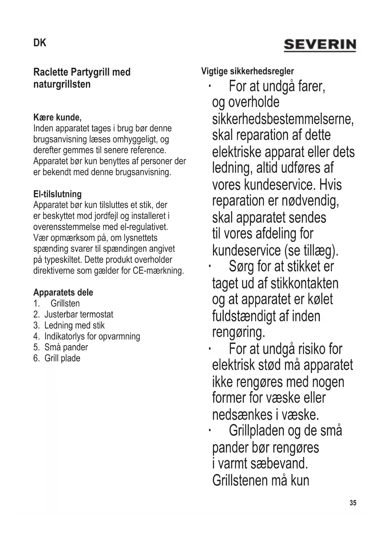 Raclette Partygrill med naturgrillsten Kære kunde, Inden apparatet tages i brug bør denne brugsanvisning læses omhyggeligt, og derefter gemmes til senere reference. Apparatet bør kun benyttes af personer der er bekendt med denne brugsanvisning. El-tilslutning Apparatet bør kun tilsluttes et stik, der er beskyttet mod jordfejl og installeret i overensstemmelse med el-regulativet. Vær opmærksom på, om lysnettets spænding svarer til spændingen angivet på typeskiltet. Dette produkt overholder direktiverne som gælder for CE-mærkning. Apparatets dele