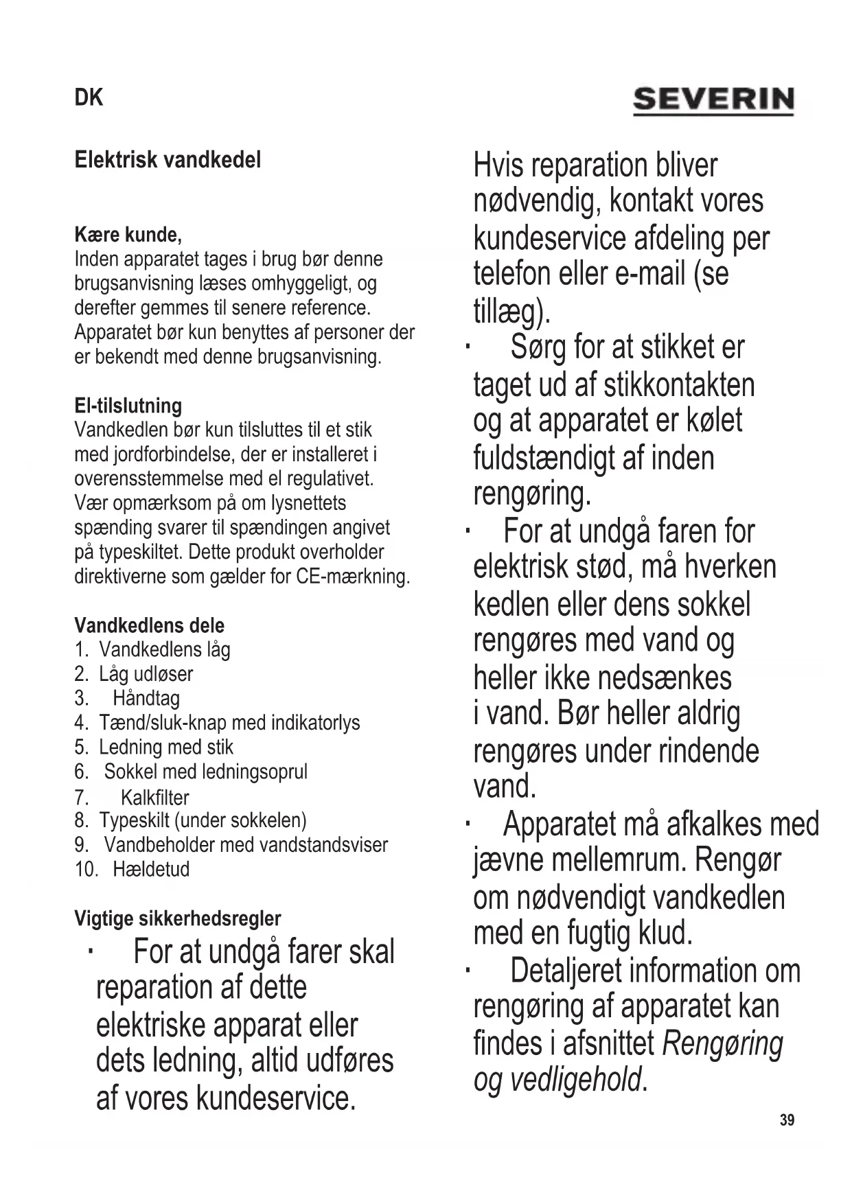 Vigtige sikkerhedsregler ∙ For at undgå farer skal reparation af dette elektriske apparat eller dets ledning, altid udføres af vores kundeservice. Hvis reparation bliver nødvendig, kontakt vores kundeservice afdeling per telefon eller e-mail (se tillæg). ∙ Sørg for at stikket er taget ud af stikkontakten og at apparatet er kølet fuldstændigt af inden rengøring. ∙ For at undgå faren for elektrisk stød, må hverken kedlen eller dens sokkel rengøres med vand og heller ikke nedsænkes i vand. Bør heller aldrig rengøres under rindende vand. ∙ Apparatet må afkalkes med jævne mellemrum. Rengør om nødvendigt vandkedlen med en fugtig klud. ∙ Detaljeret information om rengøring af apparatet kan ndesiafsnittetRengøring og vedligehold. DK40 104 x 142 mm ∙ Dette apparat kan benyttes af børn (som er mindst 8 år) og af personer med reducerede fysiske, sensoriske eller mentale evner, eller mangel på erfaring eller viden, såfremt de har fået vejledning og instruktion i brugen af dette apparat og fuldt ud forstår alle farer og forholdsregler vedrørende sikkerheden som brug af apparatet medfører. ∙ Børn må aldrig få lov til at lege med apparatet. ∙ Børn må aldrig få lov til at udføre rengørings- eller vedligeholdelsesarbejde på dette apparat, medmindre de er under opsyn og mindst 8 år gamle. ∙ Apparatet og dets ledning må altid holdes væk fra børn som er yngre en 8 år. ∙ Dette apparat er beregnet til privat brug eller i tilsvarende omgivelser, såsom - i tekøkkener, kontorer eller andre mindre virksomheder, - landbrugsvirksomheder, - af kunder på hoteller, moteller m.m. og tilsvarende foretagender, - B&B pensionater. ∙ Kabinettetsydreader bliver varme under brug og forbliver varme et godt stykke tid bagefter. ∙ Efterlad ikke vandkedlen uden opsyn når den er tændt; brug kun rent vand og sørg for altid at overholde minimum (0,5 l) og maksimum (1,7 l) markeringerne for vandstand, når der fyldes vand på kedlen. Overfyldning af vandbeholderen kan104 x 142 mm