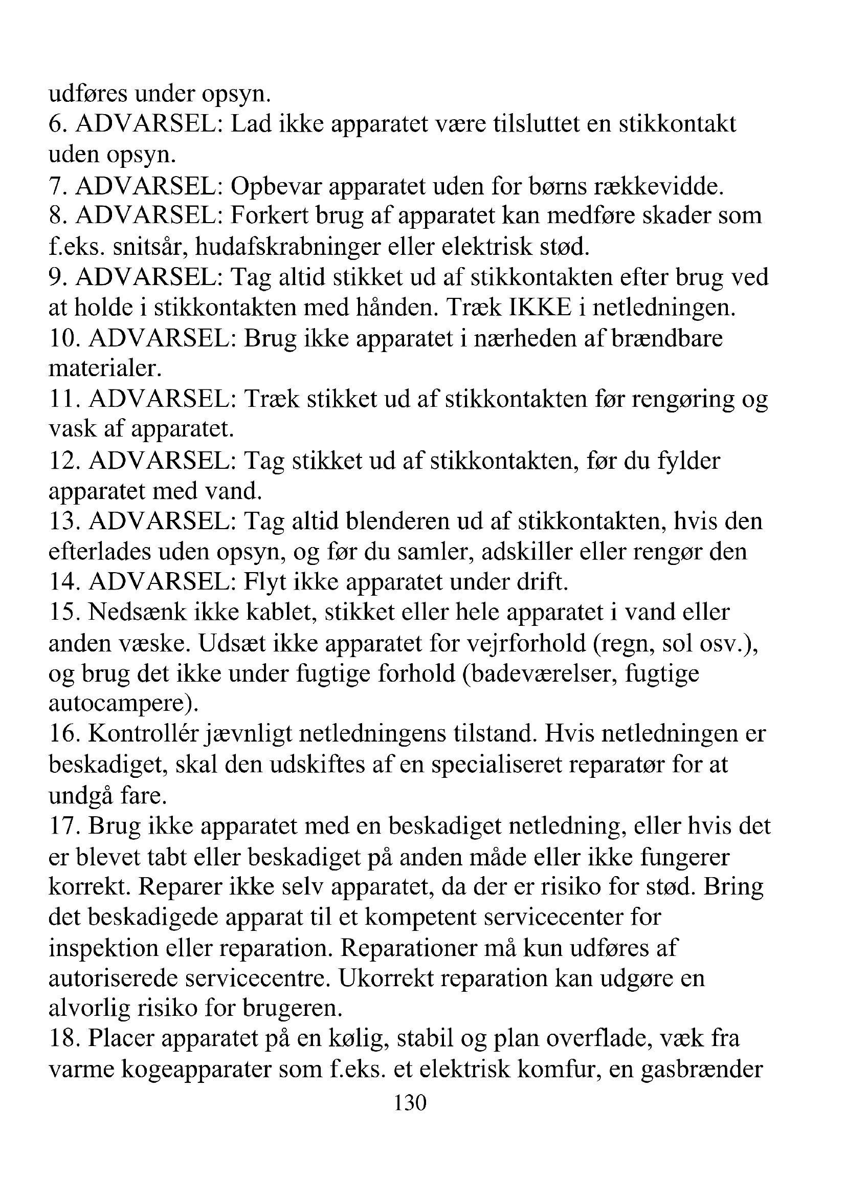 8. ADVARSEL: Forkert brug af apparatet kan medføre skader som