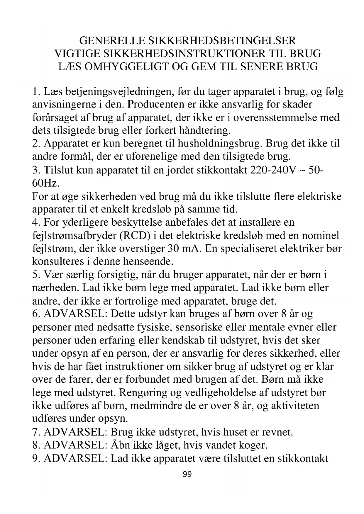 10. ADVARSEL: Opbevar apparatet utilgængeligt for børn.