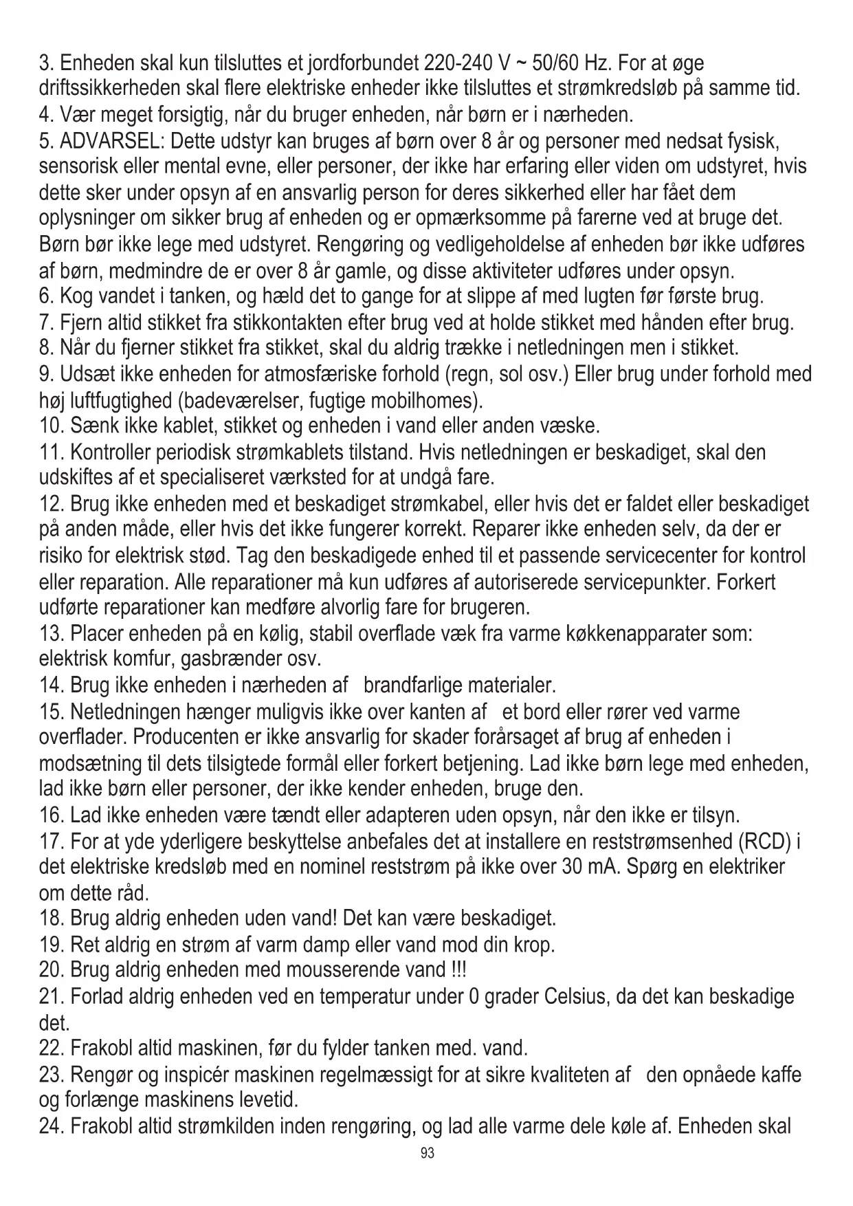 6) Når afkalkningsmidlet begynder at strømme ned i et tomt kop, skal du indsætte spidsen af dampdysen (13) i en kop fyldt med koldt vand96 og trykke på dampknappen (5). 7) Vent et par sekunder, og sluk for enheden. Efter afkalkning skal enheden skylles tre gange med rent vand. Gentag trin 1 til 7, fyld vandtanken (9) med rent vand for at gøre det. Fejlfinding Symptom: Intet vand / ingen damp Årsag 1: Om vandtanken (9) har vand inde i / er på plads? Løsning 1: Tilsæt vand til tanken (9). Årsag 2: Der tilsættes ikke vand på forhånd i maskinen. Løsning 2: Metode til tilsætning af vand: tryk på knappen Manuel kaffekop (4), pumpen begynder at pumpe vand ind i enheden, tryk på knappen Manuel kaffekop (4) efter nogle få sekunder. Årsag 3: Maskinen afslutter ikke forvarmningen. Løsning 3: Vent. Maskinen kan lave kaffe, når opvarmningen er afsluttet. Opvarmningen afsluttes, når lysindikatoren (19) skifter fra blå blinkende til altid at være på blå. Symptom: Ingen damp Årsag 1: Damphul blokeret Løsning 1: Brug en lille ledning til at stikke det lille hul i bunden af dampdysen (13), rens det på denne måde. Opløsning 2. Når mælkeskummet er færdigt, skal du udføre en varmtvandsfunktion for at rense damprøret. Symptom: Dårligt mælkeskum Årsag 1: Er det helmælk? Løsning 1: Brug helmælk. Symptom: Dårligt mælkeskum Årsag 1: Dampknappen (5) begynder at skumme mælkeskum op, før enheden opvarmes helt. Løsning 1: Vent. Begynd med at dampe, når lysindikatoren (19) skifter farve fra rød blinkende til kontinuerlig rød. TEKNISK DATA: Kapacitet max: 1,6 liter Spænding: 220-240V ~ 50 / 60Hz Effekt: 850W Power Max: 1000W Tryk: 15 barer Af hensyn til miljøet . Venligst overfør papemballage til affaldspapir. Hæld polyethylenposer (PE) i plastbeholderen Slidt enhed skal returneres til det relevante punkt opbevaring, fordi det er farligt i enheden ingredienser kan udgøre en trussel for miljøet. Den elektriske enhed skal overleveres for at begrænse dets genanvendelse og brug. Hvis i enheden der er batterier, fjern dem og vende tilbage til punktet opbevares separat. (UA) УКРАЇНСЬКА ЗАГАЛЬНІ УМОВИ БЕЗПЕКИ ВАЖЛИВІ Вказівки щодо безпеки. ЗАБУДУЙТЕ ЗАБЕЗПЕЧНО І ПРОБЛЕМУЙТЕ ЗА МАЙБУТНЄ