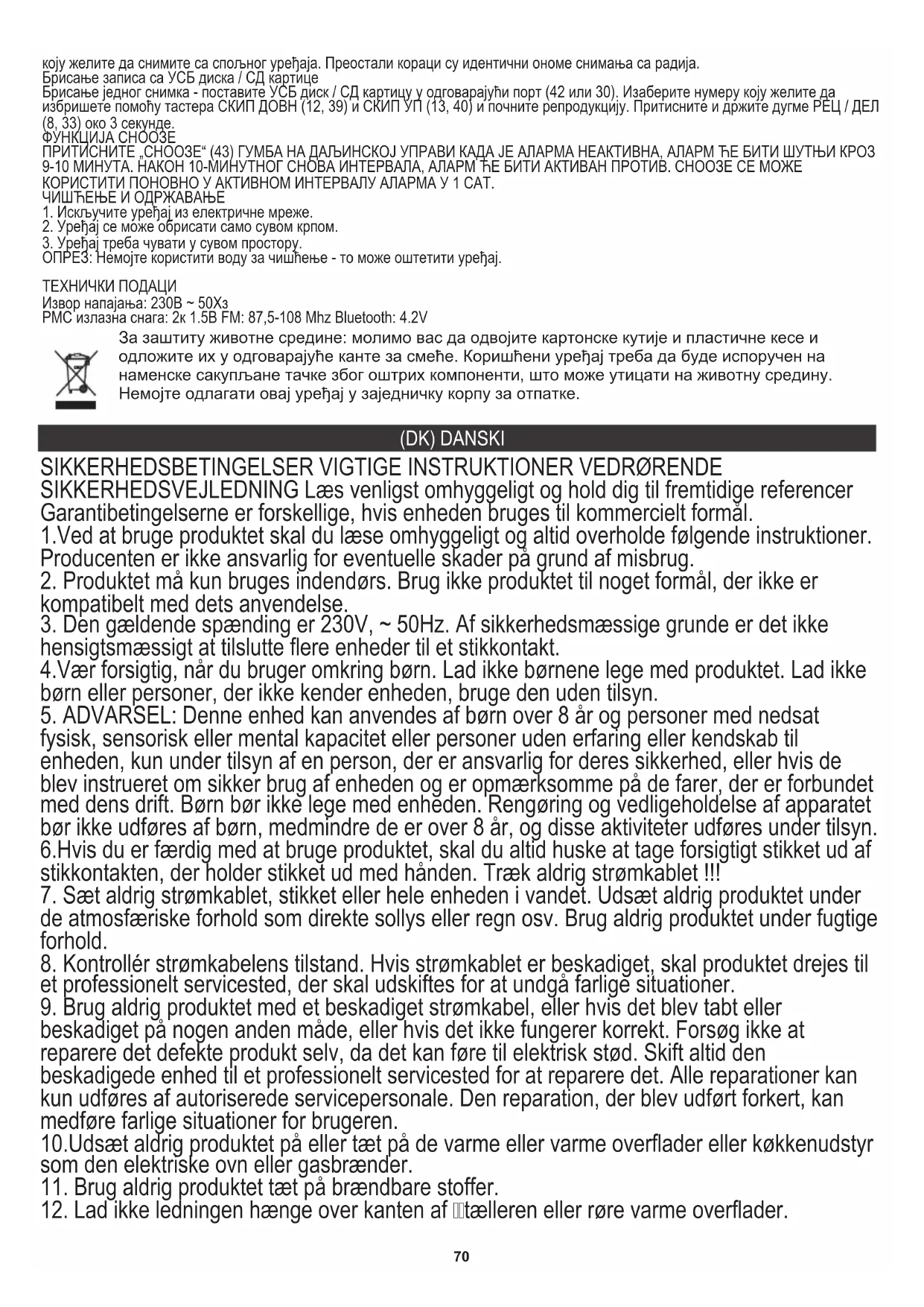 - ADVARSEL: Denne enhed kan anwendes af børn over 8 År og personer med nedsat fysisk, sensorisk eller mental kapacitet eller personer,uden erfaring uller kendskap til enheden, kun under tilsyn af en person, der er ansvarlig for deres sikkerhed, uller hvis de blev instrueret om sikker brug af enheden og er opmaerk somme pa de farer, der er forbundet med dens drift. Børn bør ikke lege med enheden. Rengoring og vedligeholdelse af apparatet børIkke udfores af børn, medmindre de er over 8 År, og disse aktivitet udfores under tilsyn. 6.Hvis du er færdig med at bruge produitet, skal du altid huske at tage forsigtigt stikket ud af stikkontakten, der holder stikket ud med handen. Træk aldrig strømkablet !!!