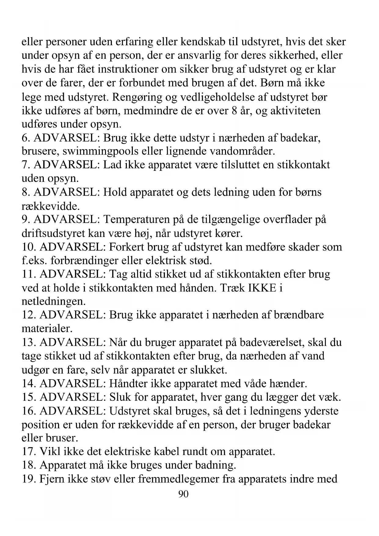 personer med begrænset fysisk, sensorisk eller mental kapacitet90 eller personer uden erfaring eller kendskab til udstyret, hvis det sker under opsyn af en person, der er ansvarlig for deres sikkerhed, eller hvis de har fået instruktioner om sikker brug af udstyret og er klar over de farer, der er forbundet med brugen af det. Børn må ikke lege med udstyret. Rengøring og vedligeholdelse af udstyret bør ikke udføres af børn, medmindre de er over 8 år, og aktiviteten udføres under opsyn.