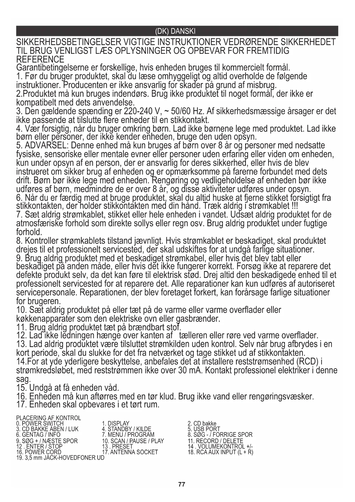 17. Enheden skal opbevares i et tørt rum.