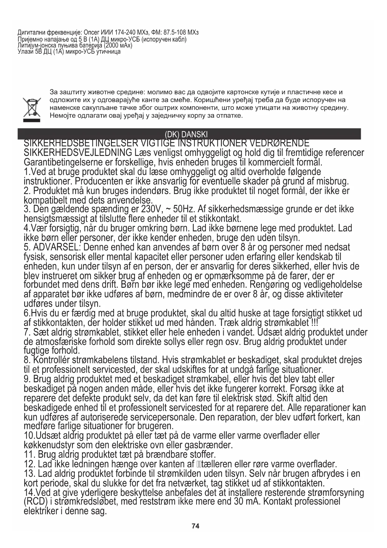 kort periode, skal du slukke for det fra netværket, tag stikket ud af stikkontakten. 14.Ved at give yderligere beskyttelse anbefales det at installere resterende strømforsyning (RCD) i strømkredsløbet, med reststrøm ikke mere end 30 mA. Kontakt professionel elektriker i denne sag.75