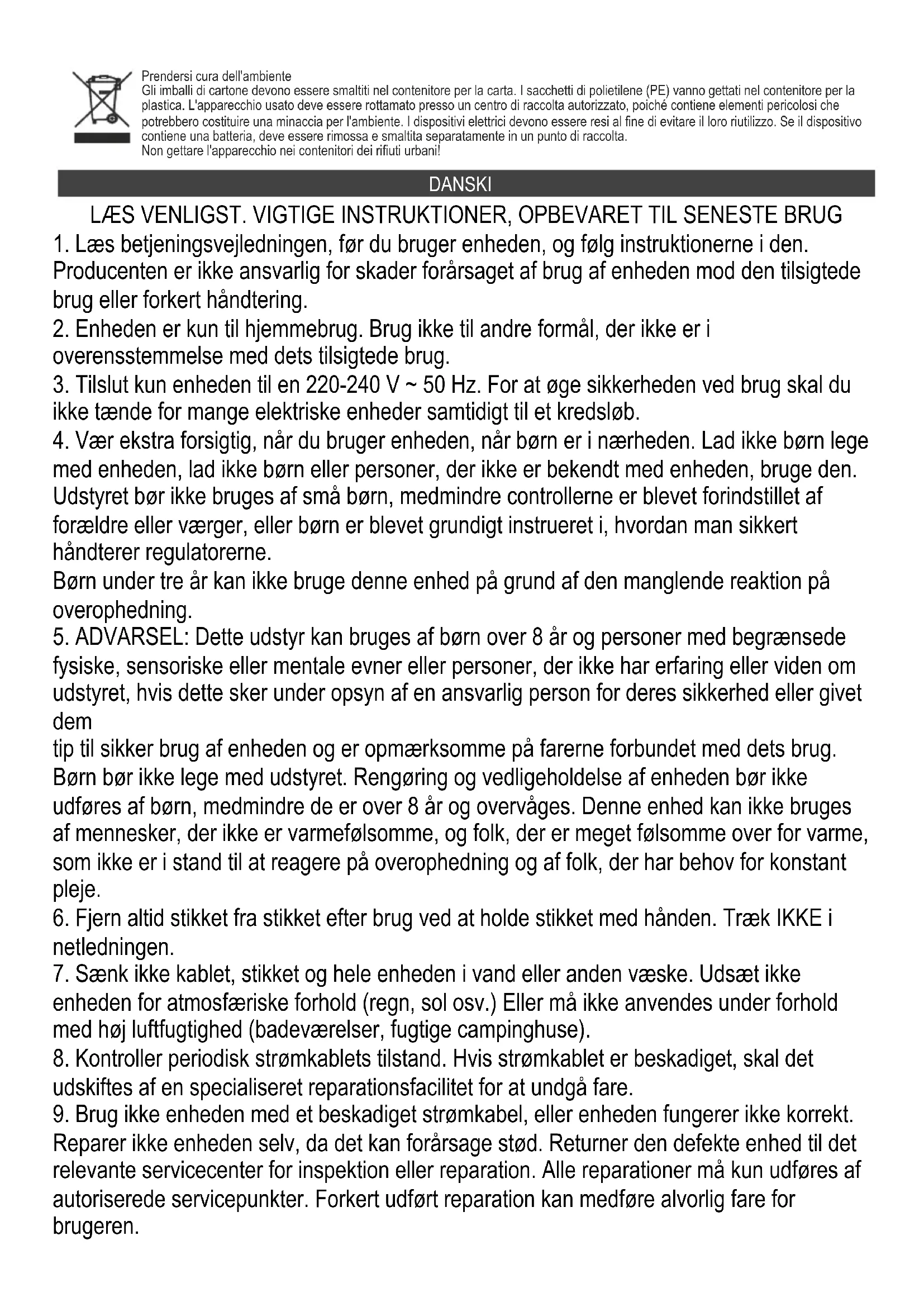 fysiske, sensoriske eller mentale evner eller personer, der ikke har erfaring eller viden om udstyret, hvis dette sker under opsyn af en ansvarlig person for deres sikkerhed eller givet dem tip til sikker brug af enheden og er opmærksomme på farerne forbundet med dets brug. Børn bør ikke lege med udstyret. Rengøring og vedligeholdelse af enheden bør ikke udføres af børn, medmindre de er over 8 år og overvåges. Denne enhed kan ikke bruges af mennesker, der ikke er varmefølsomme, og folk, der er meget følsomme over for varme, som ikke er i stand til at reagere på overophedning og af folk, der har behov for konstant pleje.