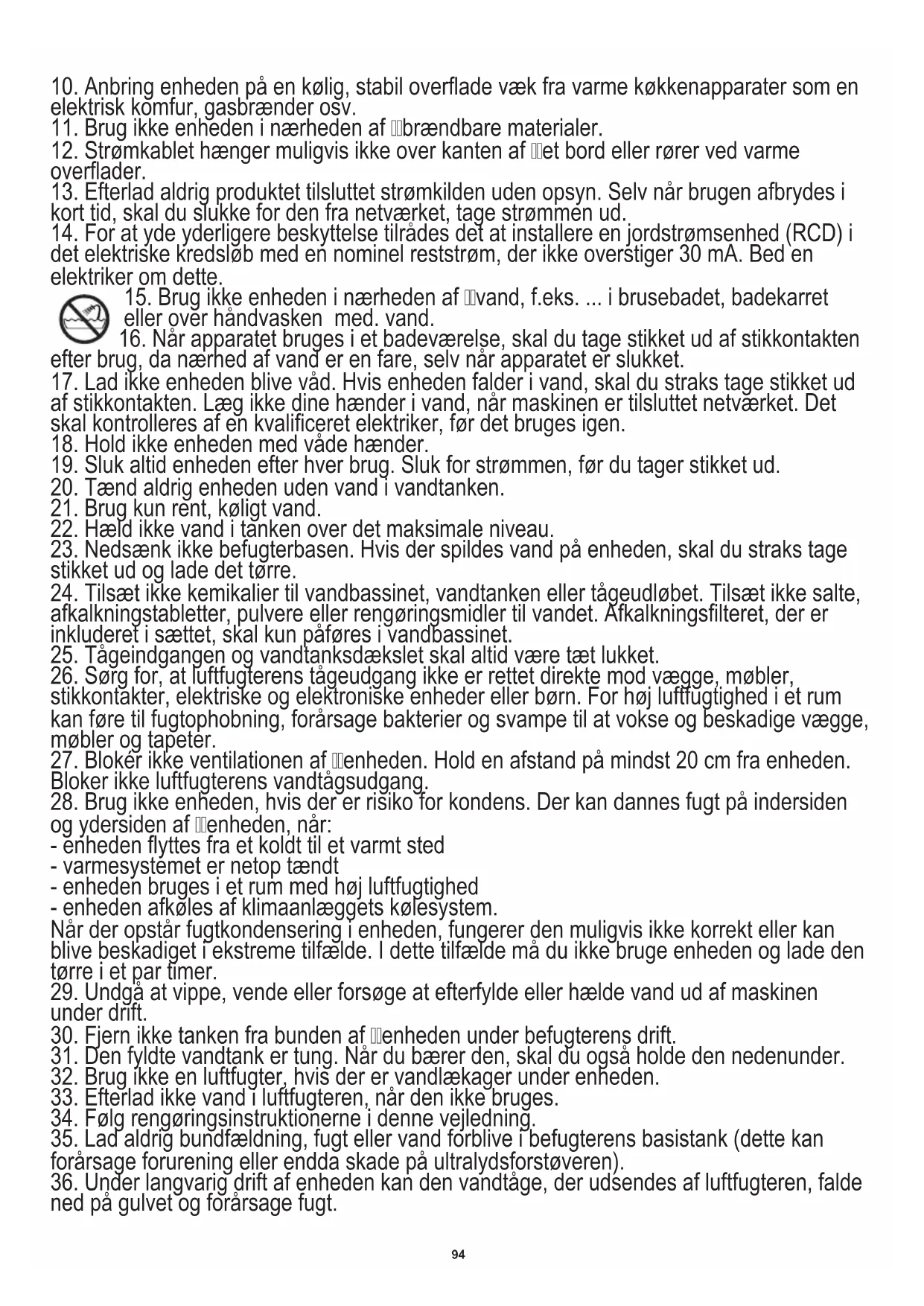 28. Brug ikke enheden, hvis der er risiko for kondens. Der kan dannes fugt på indersiden