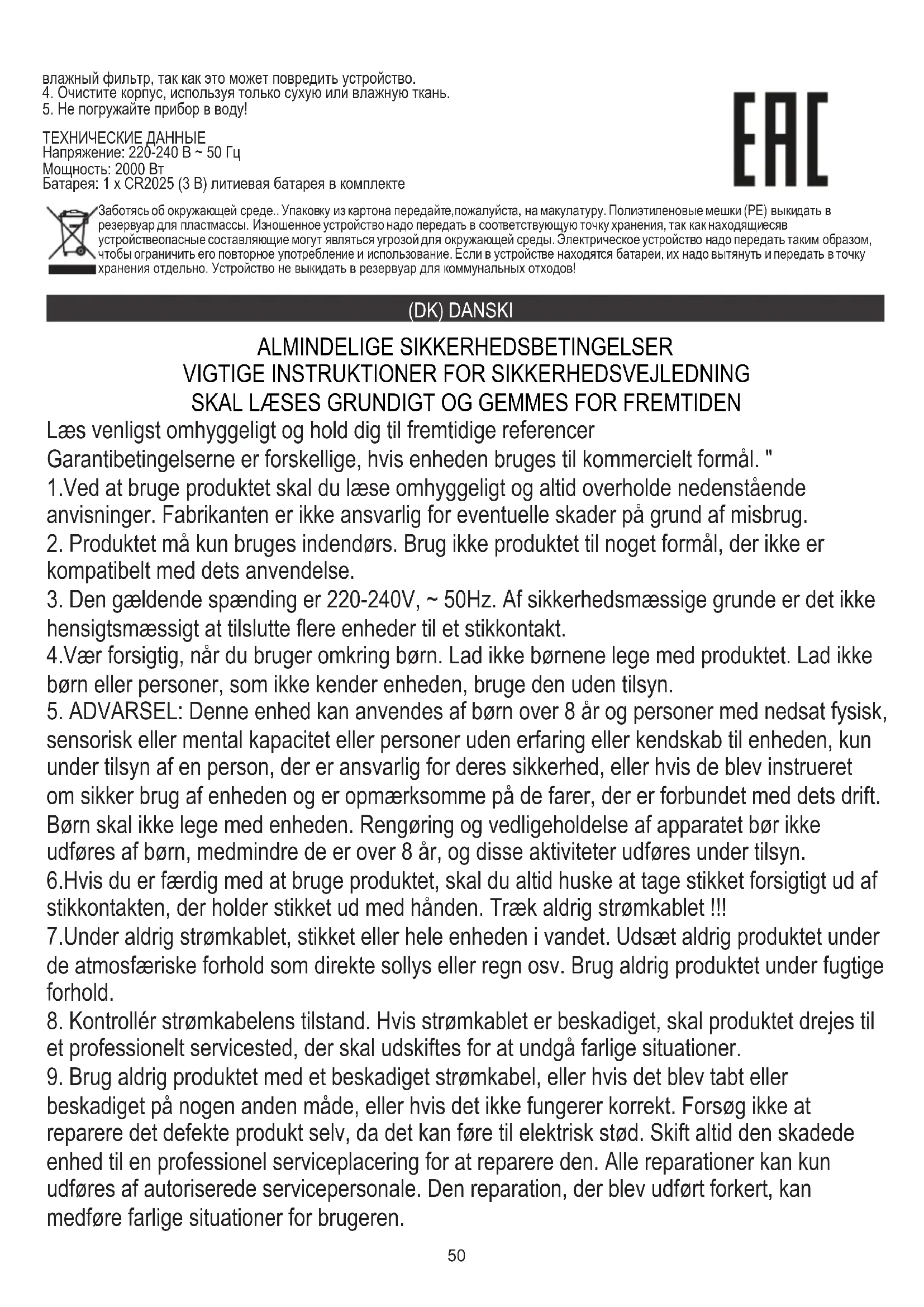 TEKNISK DATA Spænding: 220-240V ~ 50Hz Effekt: 2000W Batteri: 1 x CR2025 (3V) lithiumbatteri inkluderet Af hensyn til miljøet . Venligst overfør papemballage til affaldspapir. Hæld polyethylenposer (PE) i plastbeholderen Slidt enhed skal returneres til det relevante punkt opbevaring, fordi det er farligt i enheden ingredienser kan udgøre en trussel for miljøet. Den elektriske enhed skal overleveres for at begrænse dets genanvendelse og brug. Hvis i enheden der er batterier, fjern dem og vende tilbage til punktet opbevares separat.