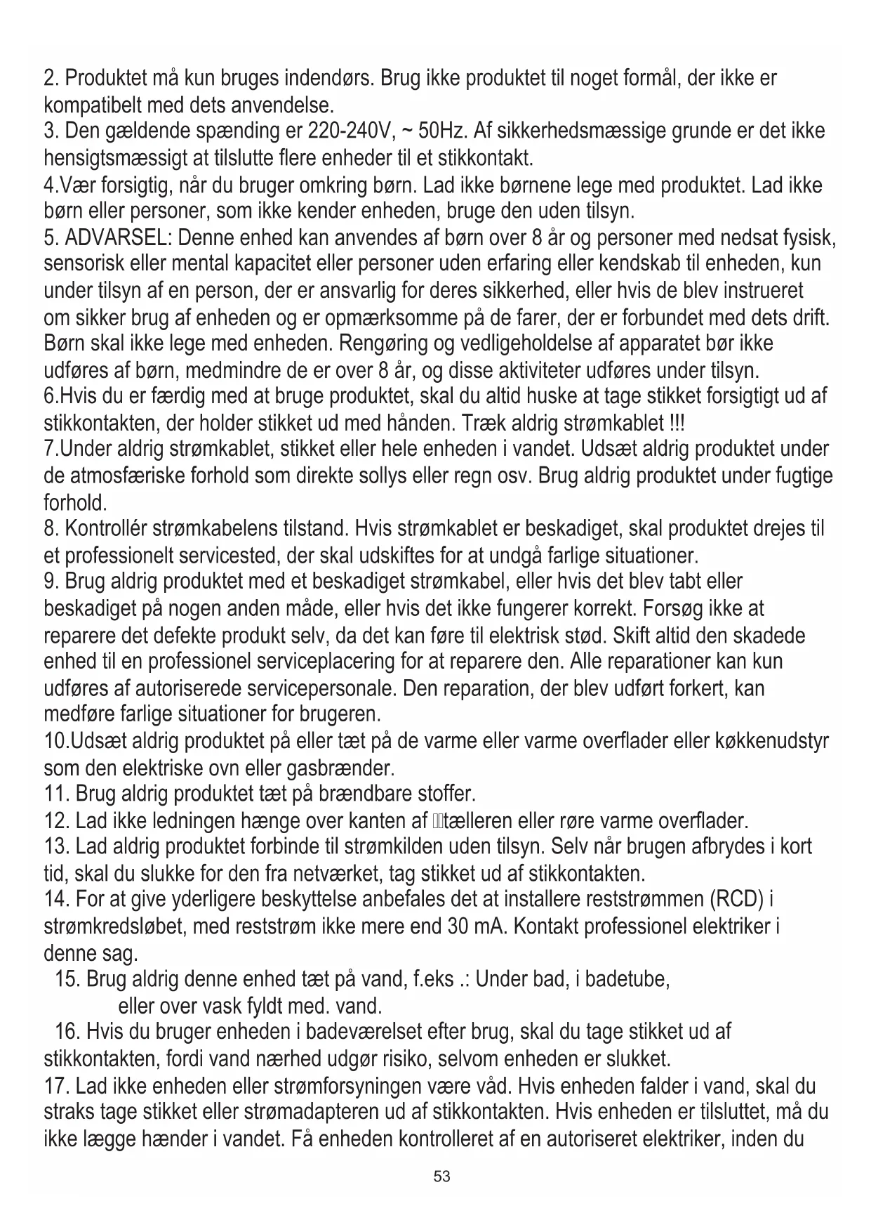 sensorisk eller mental kapacitet eller personer uden erfaring eller kendskab til enheden, kun under tilsyn af en person, der er ansvarlig for deres sikkerhed, eller hvis de blev instrueret om sikker brug af enheden og er opmærksomme på de farer, der er forbundet med dets drift. Børn skal ikke lege med enheden. Rengøring og vedligeholdelse af apparatet bør ikke udføres af børn, medmindre de er over 8 år, og disse aktiviteter udføres under tilsyn. 6.Hvis du er færdig med at bruge produktet, skal du altid huske at tage stikket forsigtigt ud af stikkontakten, der holder stikket ud med hånden. Træk aldrig strømkablet !!! 7.Under aldrig strømkablet, stikket eller hele enheden i vandet. Udsæt aldrig produktet under de atmosfæriske forhold som direkte sollys eller regn osv. Brug aldrig produktet under fugtige forhold.