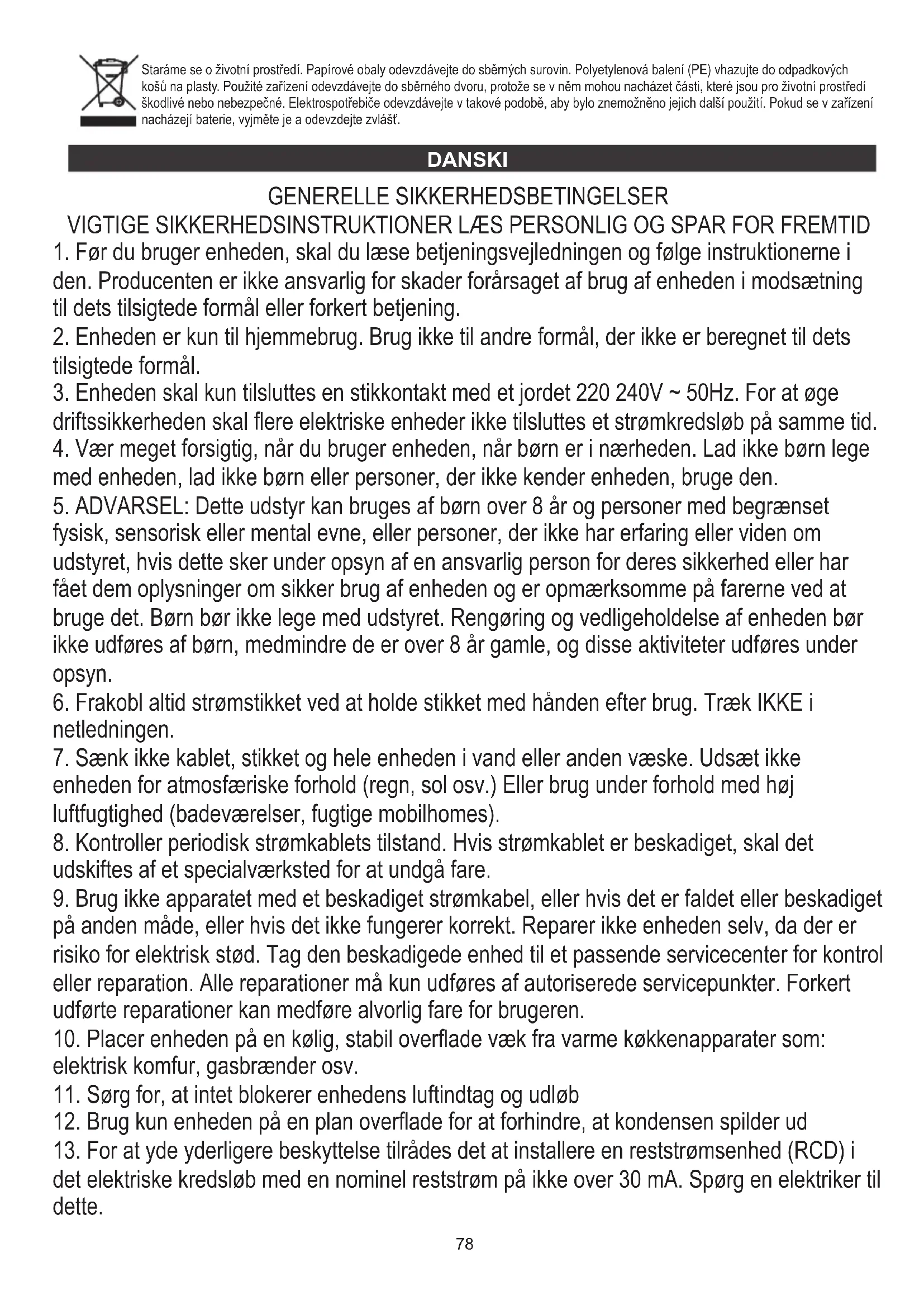 fysisk, sensorisk eller mental evne, eller personer, der ikke har erfaring eller viden om udstyret, hvis dette sker under opsyn af en ansvarlig person for deres sikkerhed eller har fået dem oplysninger om sikker brug af enheden og er opmærksomme på farerne ved at bruge det. Børn bør ikke lege med udstyret. Rengøring og vedligeholdelse af enheden bør ikke udføres af børn, medmindre de er over 8 år gamle, og disse aktiviteter udføres under opsyn. GENERELLE SIKKERHEDSBETINGELSER