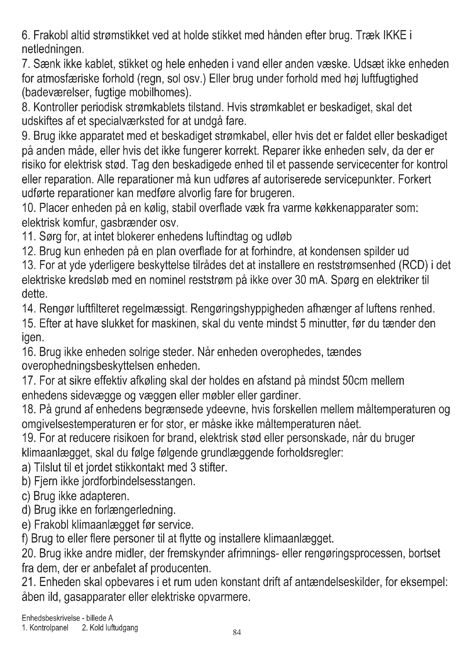 klimaanlægget, skal du følge følgende grundlæggende forholdsregler: a) Tilslut til et jordet stikkontakt med 3 stifter. Enhedsbeskrivelse - billede A