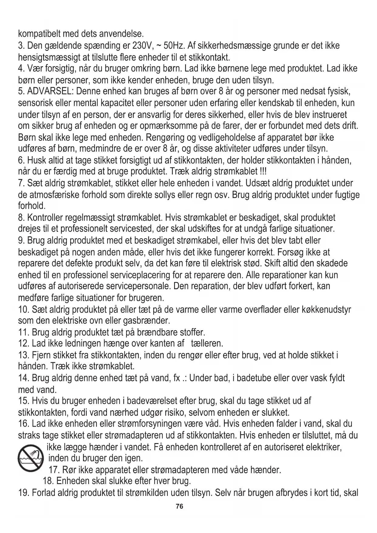 7. Sæt aldrig strømkablet, stikket eller hele enheden i vandet. Udsæt aldrig produktet under