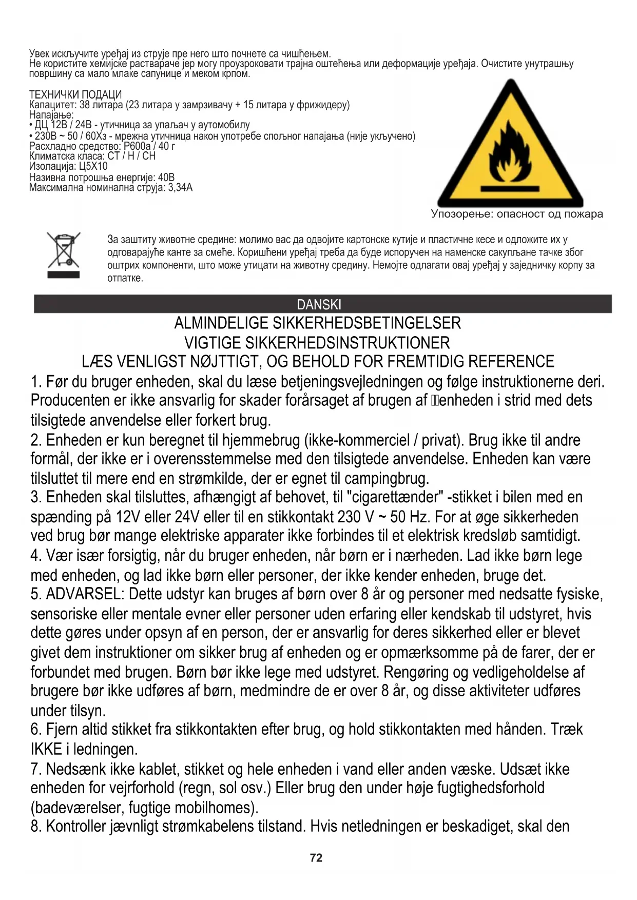 Упозорење: опасност од пожара73 - ADVARSEL: Brug ikke elektrisk udstyr inde i fødevareopbevaringsrummet af en anden type end den, der anbefales af producenten udskiftes af et specialværksted for at undgå fare.