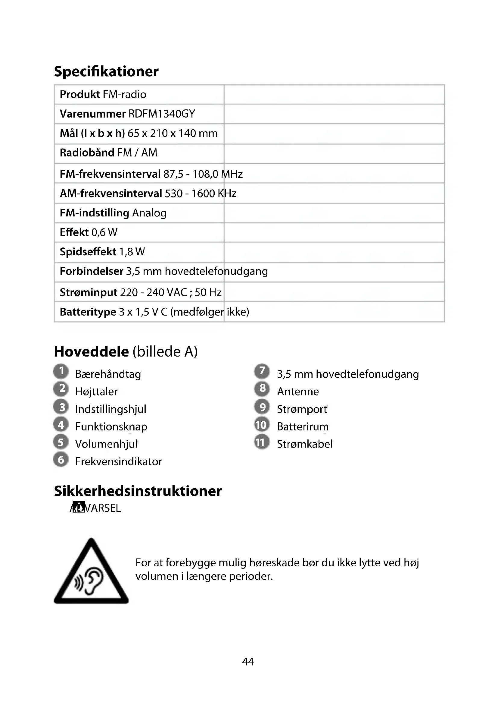 Vejledning til hurtig start FM-radio RDFM1340GY Yderligere oplysninger ndes i den udvidede manual online: ned.is/rdfm1340gy Tilsigtet brug RDFM1340GY er en bærbar AM/FM-radio, der kan bruges på farten med batterier, eller som kan sluttes til en stikkontakt. Dette produkt er ikke beregnet til professionel brug. Enhver modicering af produktet kan have konsekvenser for sikkerhed, garanti og korrekt funktion.44 Specikationer Produkt FM-radio Varenummer RDFM1340GY Mål (l x b x h) 65 x 210 x 140 mm Radiobånd FM / AM FM-frekvensinterval 87,5 - 108,0 MHz AM-frekvensinterval 530 - 1600 KHz FM-indstilling Analog Eekt 0,6 W Spidseekt 1,8 W Forbindelser 3,5 mm hovedtelefonudgang Strøminput 220 - 240 VAC ; 50 Hz Batteritype 3 x 1,5 V C (medfølger ikke) Hoveddele (billede A)