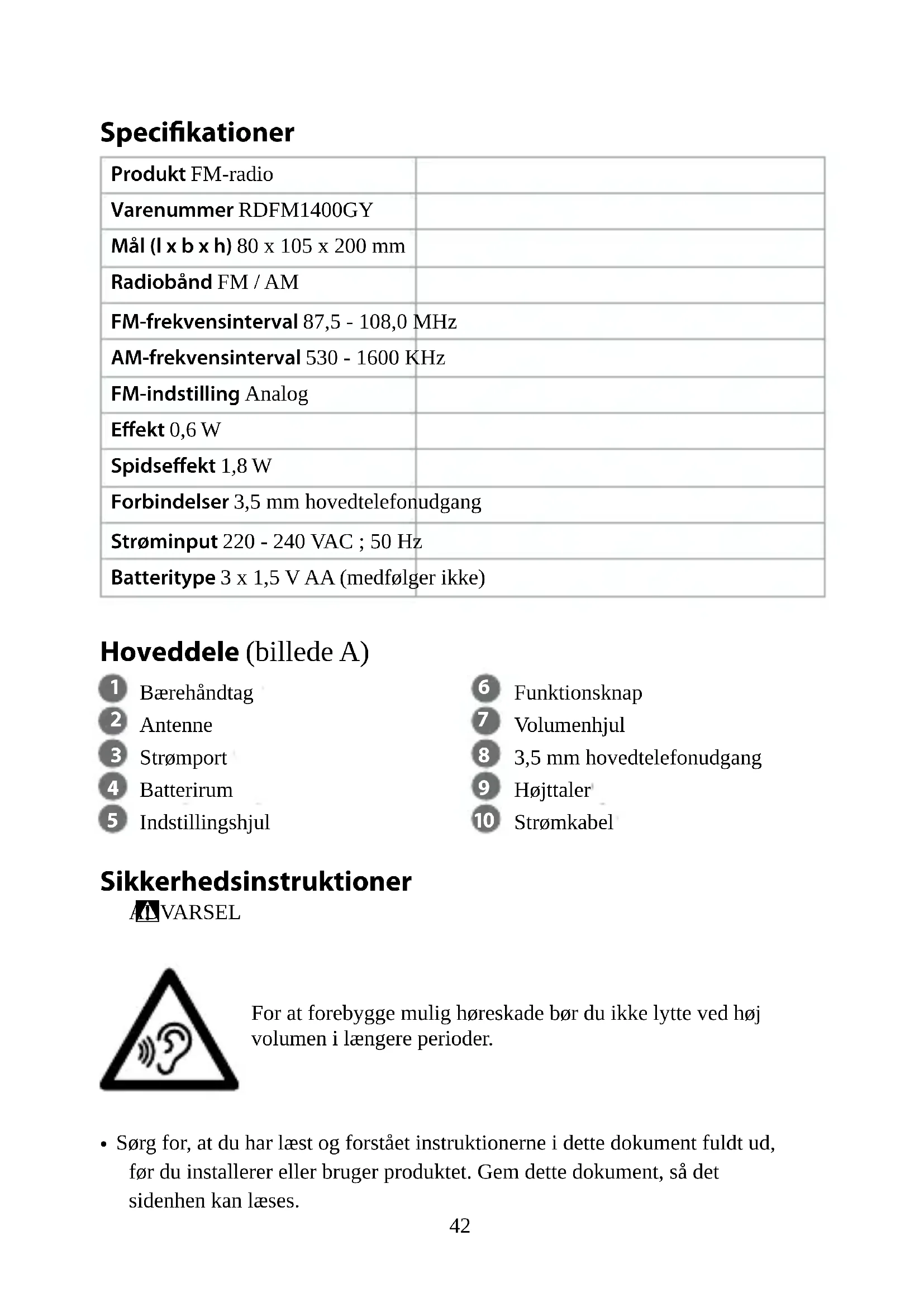 Vejledning til hurtig start FM-radio RDFM1400GY Yderligere oplysninger ndes i den udvidede manual online: ned.is/rdfm1400gy Tilsigtet brug RDFM1400GY er en bærbar AM/FM-radio, der kan bruges på farten med batterier, eller som kan sluttes til en stikkontakt.Dette produkt er ikke beregnet til professionel brug.Enhver modicering af produktet kan have konsekvenser for sikkerhed, garanti og korrekt funktion.42 Specikationer Produkt FM-radio Varenummer RDFM1400GY Mål (l x b x h) 80 x 105 x 200 mm Radiobånd FM / AM FM-frekvensinterval 87,5 - 108,0 MHz AM-frekvensinterval 530 - 1600 KHz FM-indstilling Analog Eekt 0,6 W Spidseekt 1,8 W Forbindelser 3,5 mm hovedtelefonudgang Strøminput 220 - 240 VAC ; 50 Hz Batteritype 3 x 1,5 V AA (medfølger ikke) Hoveddele (billede A)