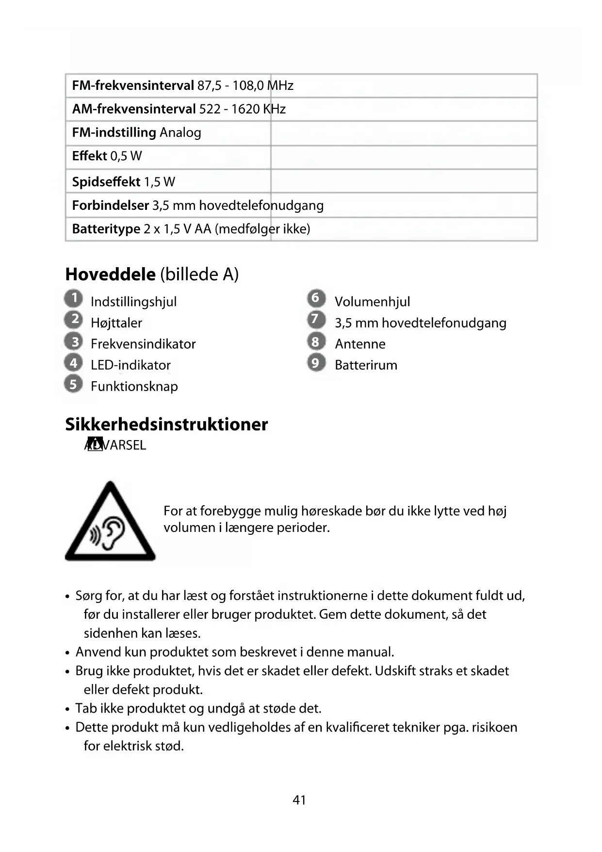 ADVARSEL For at forebygge mulig høreskade bør du ikke lytte ved høj volumen i længere perioder.