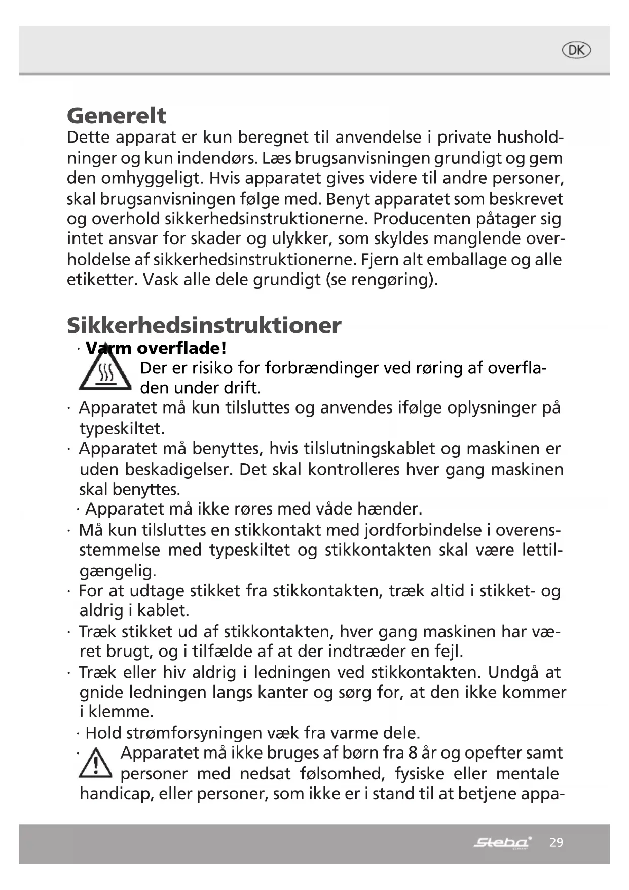 5 = mørke vafler Bagetid: ca. 4-5 minutter (alt efter smag) For at fjerne vaflerne må der kun anvendes træ eller varmebestandigt plastbestik. Afbryd stikket efter afslutning af bagningen. Dejen ændrer sin struktur og da der er æg i, er det vigtigt at bruge hele dejen og ikke gemme på noget! Af hygiejniske årsager, er den første vaffel ikke spiselig!33 Søde vafler 250 gr. mel 3 spiseske sukker 1 pak vaniljesukker 1 pak bagepulver ¼ teske salt 3 æg, delt. 125 gr. smeltet smør 300 ml mælk Rum-Aroma Puddersukker til dekorering Bland mel, sukker, vaniljesukker, bagepulver og salt. Tilføj æggeblommerne, mælk, smeltet smør og aroma. Vend melblandingen under resten. Pisk æggehviden og vend under resten. Saltede vafler 250 gr. mel 1 pak bagepulver ¼ teske salt 3 æg, delt 300 ml mælk Peber 100 gr. fintskåret skinke 100 gr. reven ost Bland mel, bagepulver og salt. Bland æggeblommerne og peber. Vend melblandingen i. Tilsæt skinke og ost. Pisk æggehviden og vend under resten. Godt råd: Man kan variere ingredienserne ved f.eks. at blande groft revne æbler, rosiner, oliven i dejen. Kærnemælk eller fløde giver en anden smag. Andre dejtyper fra en kogebog kan let bruges i dette apparat. Lad dejen hvile i ca. 30 minutter.34 Fejlfinding Kære kunde, Tak fordi du købte et kvalitetsprodukt fra Steba. Tabellen nedenfor giver hjælp til problemer, der kan opstå under brug af enheden. For mange problemer er der en simpel løsning, for ikke alle fejlfunktioner behøver at være alvorlige. Gennemgå ven- ligst den nedenstående liste, inden kundeservice kontaktes. Problem Årsag Problem behandling Lampen lyser ikke, selvom stikket er tilsluttet en stikkontakt. ∙ Ingen strøm ∙ Grunden for mange enheder på en linje er sikringen gået ∙ Er stikket sat korrekt i stikkontakten ∙ Tjek sikringen Under brug lyser den røde lampe ikke/ går ud ∙ Apparatet har opnået den ønskede tempe- ratur ∙ Når temperaturen er opnået lyser lampen og går ud. Dej på arbejdspladen ∙ Puttet for meget dej i apparatet ∙ Put mindre dej i ap- paratet Bruningsgraden er for lav ∙ Temperaturen er for lav ∙ Bagetiden var for kort ∙ Dejen har for meget væske ∙ Skru op for tempera- turen ∙ Ændre på bagetiden Non- stick effekten på pladen er dårlig/ ridser i overfladen ∙ Non- stick belægningen blev beskadiget da vaf- lerne blev taget ud ∙ Ingen reklamationsret35 Korrekt bortskaffelse af dette produkt: Nedslidte maskiner skal straks tages ud af brug. Inden for den Europæiske Union, indikerer dette symbol, at produktet ikke må bortskaffes sammen med andet husholdningsaffald. Elektronisk affald indeholder værdifulde og genanvendelige materialer, som burde blive gen- brugt for ikke at skade naturen eller menneskers sundhed igennem ukontrol- leret affaldshåndtering. Sørg derfor altid for at aflevere elektronisk affald på en genbrugsstation eller sende det til bortskaffelse hos forhandleren. Denne sørger he- refter for at maskinenens komponenter genbruges. Bortskaffelse af emballage: Smid aldrig blot emballagen ud, men bortskaf det på korrekt og ansvarlig vis til genanvendelse. Emballage: ∙ Aflever papir-, pap- og bølgepapemballage på genbrugsstationen. ∙ Forpakningsdele af plastik og folie skal ligeledes afleveres i den dertil indrettede opsamlingsbeholder I eksemplerne på mærkning af plastmaterialer står: PE for polyethy- len, kodenummer 02 for PE-HD, 04 for PE-LD, PP for polypropylen, PS for polystyrol. Kundeservice: Hvis din maskine mod forventning får brug for service, bedes du kontakte os på følgende adresse. Vi afhenter apparatet hvis den stadig er dækket af garantien. Ap- paratet skal pakkes ind til transport. Ufrankerede pakker modtages ikke! STEBA Elektriske Apparater ApS & Co K/S Pointstr. 2, 96129 Strullendorf / Germany Salgstelefon: 09543 / 449-17 / -18, servicetelefon: 09543 / 449-44, fax: 09543 / 449-19 e-Mail: elektro@steba.com Internet: http://www.steba.com Advarsel! For at undgå væsentlige skader, der kan opstå som følge af ukyndig repa- ration, må elektroniske apparater kun repareres af autoriserede el-reparatører.36