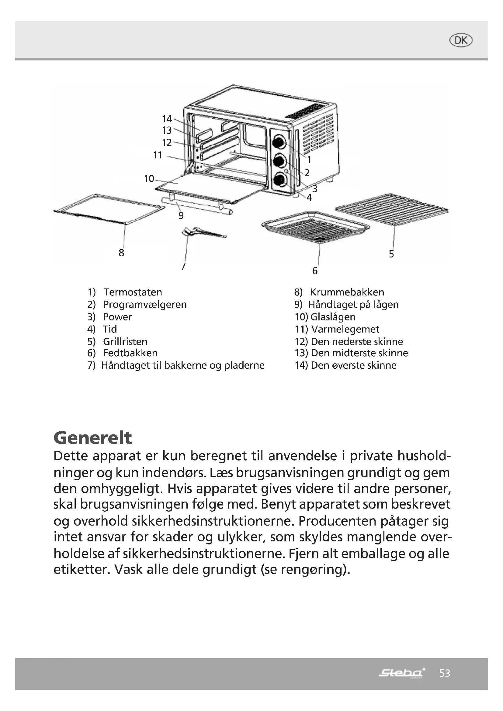 Forsigtig! Apparatet bliver varmt. Fare for for- brændinger! Under anvendelse kan temperaturen på overfladen blive meget varm! Apparatet placeres på en jævn, varmebestandig overflade og placeres ca. 70 cm fra brandbare materialer (f.eks. gardiner).56 ∙ Under anvendelse opstår varmt damp. Hold hænder og ansigt på afstand. ∙ Ved brug af et forlængerkabel skal det have et tværsnit på 1,5 mm². Ledningen på en kabeltromle altid være rullet helt ud. ∙ Ved anvendelse af et GS- godkendt 16 A multi forlængerkabel, må denne ikke belastes med mere end 3680 watt. Der er fare for brand! ∙ Vær opmærksom på, at børn ikke trækker i kablet og at ingen snubler over kablet. ∙ Apparatet skal altid afbrydes fra elnettet, hvis tilsyn ikke er til stede, og inden montering, demontering eller rengøring. ∙ Advarsel: neddryppende fedt kan føre til brand. Aldrig grill uden bradepande under. Ved udtagning af bradepanden med fedt, vær opmærksom på ikke der ikke drypper fedt på varme- strålerne. ∙ Anvend grebet til bradepanden eller risterne ved udtagning. ∙ Rengør apparatet efter brug. ∙ Husk at placere krummebakken inden brug. ∙ Hygiejne: Grundet bakterier og mug, er det vigtigt, at appara- tet altid rengøres! Rengøring ∙ Advarsel! Inden hver rengøring skal stikket udtages fra stikkontakten og apparatet skal afkøle! ∙ Apparatet må ikke nedsænkes i vand. ∙ Fedtrester skal, af hygiejniske årsager og grundet faren for brand, fjernes. ∙ Brug ikke skuremidler, ovnrens eller syreholdige rengørings- midler. ∙ Lågen, overfladerne og det indvendige kan rengøres med en fugtig klud og lidt sæbevand. Glaspladen rengøres med glas- rens og aftørres efterfølgende. ∙ Krummebakken og tilbehøret kan rengøres med varmt vand og derefter aftørres. Sæt krummebakken på plads igen.57 Arbejdspladsen Vigtig: Placer aldrig apparatet på eller ved siden af en varm over- flade (f.eks. kogeplade), men kun på en jævn, stabil og varmebe- standig bordskåner. Det er altid vigtigt at sikre, at der ikke er brændbare genstande i nærheden. Placer ikke enheden på kan- ten af bordet, så børn ikke kan komme til den, og for at den ikke falder ned ved berøring. Ibrugtagning af bageovnen Vigtigt: Bageovnen skal altid forvarmes i ca. 10 minutter, inden der skal bages eller grilles noget i den. Ovnen kan godt ryge lidt, første gang den benyttes. Stil ikke for store portioner mad ind i ovnen til opvarmning eller bagning, så de ikke kom- mer i kontakt med varmeelementerne. Stærkt fedtholdige retter skal tilberedes på grillristen på den midterste skinne, og fedtbakken skal placeres i nederste skinne. Stil eventuelt termostaten på en lidt lavere temperatur. Anbring også altid krummebak- ken i bunden af ovnen. Grillmotoren kører med, og den indvendige belysning er tændt, uanset hvil- ket program der er indstillet. Tænd- og slukuret Eftersom tænd- og slukuret arbejder mekanisk, skal uret først trækkes helt op (drejes til 90 minutter), hvorefter det stilles tilbage på den ønskede tid. Tag højde for for- varmningsperioden på 10 minutter, når tiden indstilles. Hvis maden, der skal opvar- mes, ikke bliver brun nok, kan bageperioden forlænges. Indstillinger Øvre + undervarme + varmluft Overvarme + varmluft + roterende spyd Øvre + undervarme Overvarme + roterende spyd Undervarme