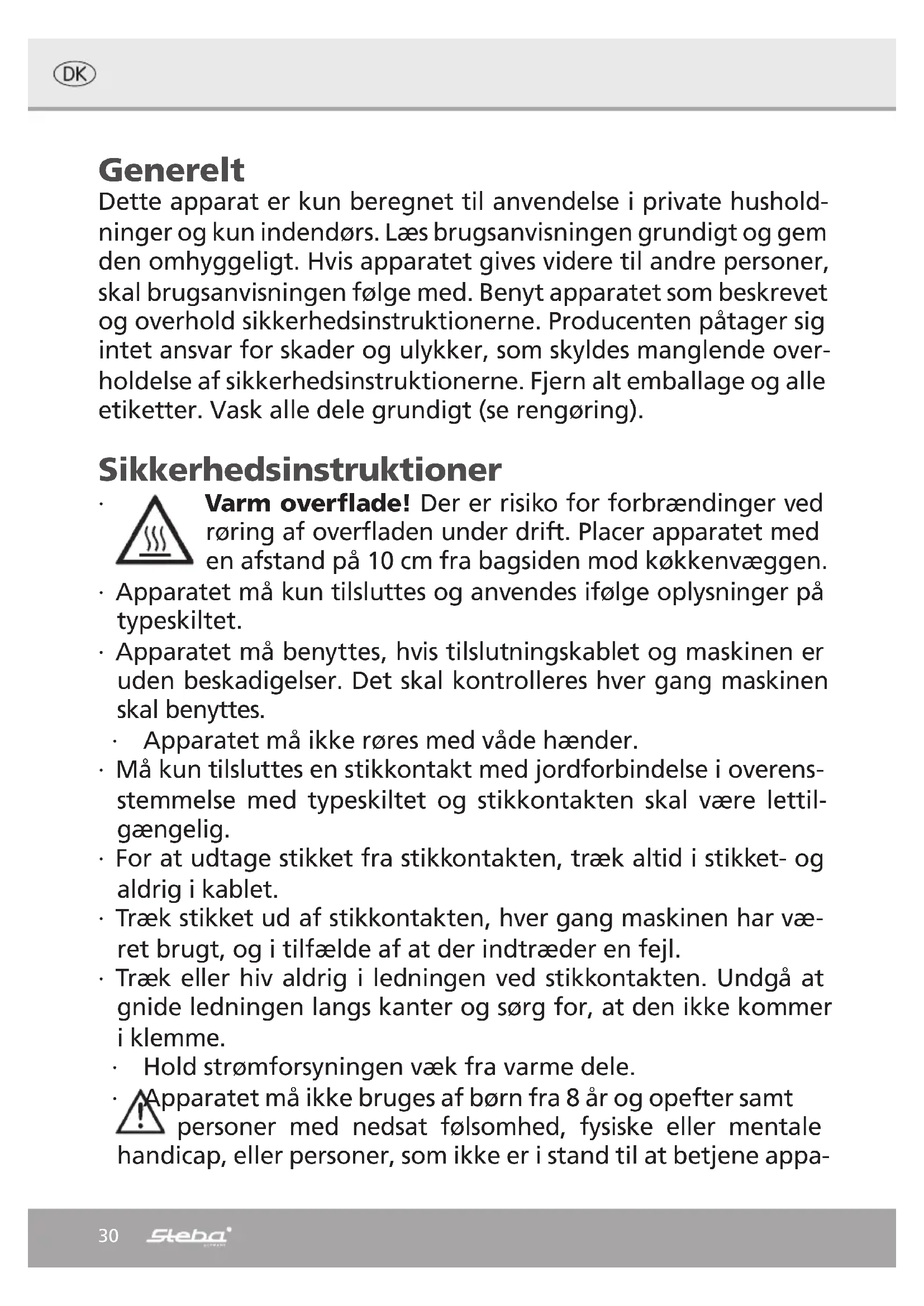 Forsigtig! Apparatet bliver varmt. Fare for for- brændinger! Under anvendelse kan temperaturen på overfladen blive meget varm! Apparatet placeres på en jævn, varmebestandig overflade og placeres ca. 70 cm fra brandbare materialer (f.eks. gardiner). ∙ Ved brug af et forlængerkabel skal det have et tværsnit på 1,5 mm². Ledningen på en kabeltromle altid være rullet helt ud. ∙ Ved anvendelse af et GS- godkendt 16 A multi forlængerkabel, må denne ikke belastes med mere end 3680 watt. Der er fare for brand! ∙ Vær opmærksom på, at børn ikke trækker i kablet og at ingen snubler over kablet. ∙ Apparatet skal altid afbrydes fra elnettet, hvis tilsyn ikke er til stede, og inden montering, demontering eller rengøring. ∙ Hygiejne: Grundet bakterier og mug, er det vigtigt, at appara- tet altid rengøres! Rengøring ∙ Advarsel! Inden hver rengøring skal stikket udtages fra stikkontakten og apparatet skal afkøle! ∙ Apparatet må ikke nedsænkes i vand. ∙ Træk regulatoren ud af grillpladen. ∙ Rengør grillplade med opvaskebørste (Ved stærk snavs læg det eventuelt i blød i sæbevand.) ∙ Kabinet tørres af med en fugtig klud og noget opvaskemiddel. ∙ Dyk aldrig regulatorkabinettet med tilførsel ned i vand!33 Arbejdspladsen Vigtig Placer aldrig apparatet på eller ved siden af en varm overflade (f.eks. kogeplade), men kun på en jævn, stabil og varmebestan- dig bordskåner. Det er altid vigtigt at sikre, at der ikke er brænd- bare genstande i nærheden. Placer ikke enheden på kanten af bordet, så børn ikke kan komme til den, og for at den ikke falder ned ved berøring. Termostat Med termostaten kan varmelegemets temperatur reguleres. Tallene på drejeskiven har følgende betydning: 1 = Termostat tændt 2 = Lav temperatur 3 = Grillning på lavt trin (f.eks. til fisk, etc.) 4 = Grillning på mellemtrin (f.esk. til mørt kød) 5 = Grillning på højeste trin Kontrollampe Så snart apparatet er tilsluttet strømnettet og termostaten er indstillet, lyser kont- rollampen. Når temperaturen er nået, slukkes denne. Forberedelse til grillning Inden grillning bør De pensle grillpladen med et tyndt lag olie. Så løsnes grillstykker- ne lettere og kan bedre vendes. Inden De lægger grillstykkerne på, så forvarm ap- paratet i ca. 5 - 10 min. ved fuld styrke. Grillstykkerne bør være fuldstændig optøede inden grillningen. Dæk grill aldrig til med sølvpapir, da varmelegemets varme ellers ikke kan blive tilført. Brug aldrig kniv på grillpladen, da denne herigennem kan blive beskadiget. Nogle tip til grillning Af hensyn til dit helbred: ∙ Håret kød skal forarbejdes øjeblikkeligt! ∙ Separat stegt fjerkræ fra rått kød, spis ikke rått og kog altid helt igennem. ∙ Saltet kød eller pølser skal ikke grilles for meget ∙ Lad ikke stivelsesholdige fødevarer (f.eks. Brød, kartofler) blive for mørke34 Vigtig note Koldpressede olier såsom B. Olivenolie bør ikke bruges som stegt fedt, da det har dårlige stegegenskaber ved høje temperaturer. På grund af de høje temperaturer (op til 250 ° C) dannes rester af olie, kødjuicer, krydderier osv. På den varme grilloverflade, og non-stick-effekten mindskes. Disse rester er også vanskelige eller umulige at fjerne fra grilloverfladen. Brug derfor kun stærkt opvarmelige olier! Fejlfinding Kære kunde, Tak fordi du købte et produkt fra Steba. Tabellen nedenfor giver hjælp til problemer, der kan opstå under brug af enheden. For mange problemer er der en simpel løsning, for ikke alle fejlfunktioner behøver at være alvorlige. Gennemgå venligst den nedenstående liste, inden kundeservice kontaktes. Problem Grund Anbefaling Rød kontrollampe lyser ikke ∙ Ingen kraft ∙ Enheden varmer ikke (endnu) ∙ Tilslut enhed ∙ Kontroller sikringen Rød kontrollampe lyser ikke under drift ∙ Enheden har nået den øn- skede temperatur ∙ Ingen fejl, lampen klokke- res, hvis enheden varmer Fedt løber på bordet ∙ Samlerbakken er ikke kor- rekt indsat ∙ Samlerbakken er ikke indsat ∙ Samlerbakken er fuld ∙ Tøm bakken, indsæt igen, og kontroller, om den er placeret korrekt Browning af ma- den er for lav ∙ For lav temperatur ∙ Grillingstid for kort ∙ Forøg temperaturen eller grilltiden Den ikke-klæ- bende effekt af grillpladen er dårlig / ridser i belægningen ∙ Overtræk er beskadiget af hårde metalgenstande ∙ Ingen grund til klage Enheden varmer ikke længere ∙ Enheden er tilsluttet en kabeltromle ∙ Fjern kabeltromlen helt, og kontroller sikringen Grillpladen kan ikke fjernes ∙ Termostatstyring er stadig isat ∙ Fjern kontrolleren først35 Korrekt bortskaffelse af dette produkt: Nedslidte maskiner skal straks tages ud af brug. Inden for den Europæiske Union, indikerer dette symbol, at produktet ikke må bortskaffes sammen med andet husholdningsaffald. Elektronisk affald indeholder værdifulde og genanvendelige materialer, som burde blive gen- brugt for ikke at skade naturen eller menneskers sundhed igennem ukontrol- leret affaldshåndtering. Sørg derfor altid for at aflevere elektronisk affald på en genbrugsstation eller sende det til bortskaffelse hos forhandleren. Denne sørger he- refter for at maskinenens komponenter genbruges. Bortskaffelse af emballage: Smid aldrig blot emballagen ud, men bortskaf det på korrekt og ansvarlig vis til genanvendelse. Emballage: ∙ Aflever papir-, pap- og bølgepapemballage på genbrugsstationen. ∙ Forpakningsdele af plastik og folie skal ligeledes afleveres i den dertil indrettede opsamlingsbeholder I eksemplerne på mærkning af plastmaterialer står: PE for polyethy- len, kodenummer 02 for PE-HD, 04 for PE-LD, PP for polypropylen, PS for polystyrol. Kundeservice: Hvis din maskine mod forventning får brug for service, bedes du kontakte os på følgende adresse. Vi afhenter apparatet hvis den stadig er dækket af garantien. Ap- paratet skal pakkes ind til transport. Ufrankerede pakker modtages ikke! STEBA Elektriske Apparater ApS & Co 