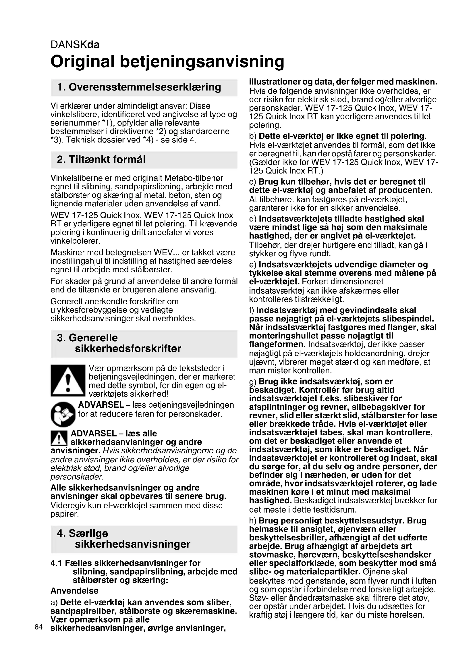 Original betjeningsanvisning Vi erklærer under almindeligt ansvar: Disse vinkelslibere, identificeret ved angivelse af type og serienummer *1), opfylder alle relevante bestemmelser i direktiverne *2) og standarderne *3). Teknisk dossier ved *4) - se side 4. Vinkelsliberne er med originalt Metabo-tilbehør egnet til slibning, sandpapirslibning, arbejde med stålbørster og skæring af metal, beton, sten og lignende materialer uden anvendelse af vand. WEV 17-125 Quick Inox, WEV 17-125 Quick Inox RT er yderligere egnet til let polering. Til krævende polering i kontinuerlig drift anbefaler vi vores vinkelpolerer. Maskiner med betegnelsen WEV... er takket være indstillingshjul til indstilling af hastighed særdeles egnet til arbejde med stålbørster. For skader på grund af anvendelse til andre formål end de tiltænkte er brugeren alene ansvarlig. Generelt anerkendte forskrifter om ulykkesforebyggelse og vedlagte sikkerhedsanvisninger skal overholdes. Vær opmærksom på de tekststeder i betjeningsvejledningen, der er markeret med dette symbol, for din egen og el- værktøjets sikkerhed! ADVARSEL – læs betjeningsvejledningen for at reducere faren for personskader. ADVARSEL – læs alle sikkerhedsanvisninger og andre anvisninger. Hvis sikkerhedsanvisningerne og de andre anvisninger ikke overholdes, er der risiko for elektrisk stød, brand og/eller alvorlige personskader. Alle sikkerhedsanvisninger og andre anvisninger skal opbevares til senere brug. Videregiv kun el-værktøjet sammen med disse papirer.
