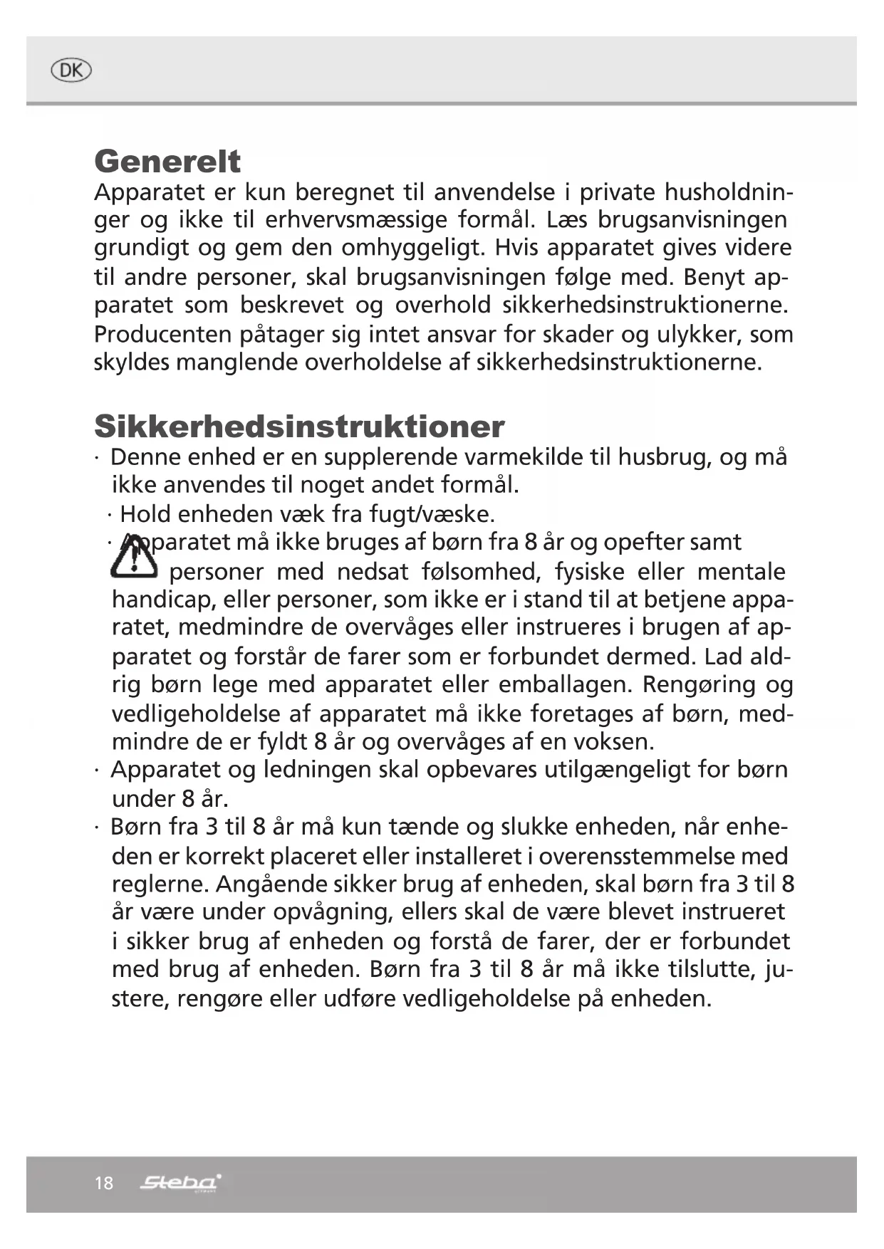 puissance thermique régulable par ventilateur NO Type de contrôle de la puissance thermique/de la température de la pièce (sélection- ner un seul type) contrôle de la puissance thermique à un palier, pas de contrôle de la température de la pièce NO contrôle à deux ou plusieurs paliers manuels, pas de contrôle de la température de la pièce OUI contrôle de la température de la pièce avec thermostat mécanique NO contrôle électronique de la température de la pièce NO contrôle électronique de la température de la pièce et programmateur journalier NO contrôle électronique de la température de la pièce et programmateur hebdomadaire NO Autres options de contrôle (sélectionner une ou plusieurs options) contrôle de la température de la pièce, avec détecteur de présence NO contrôle de la température de la pièce, avec détecteur de fenêtre ouverte NO option contrôle à distance NO contrôle adaptatif de l‘activation NO limitation de la durée d‘activation NO capteur à globe noir NO Coordonnées de contact Steba Elektrogeräte GmbH & Co.KG Pointstr. 2 96129 Strullendorf18 Generelt Apparatet er kun beregnet til anvendelse i private husholdnin- ger og ikke til erhvervsmæssige formål. Læs brugsanvisningen grundigt og gem den omhyggeligt. Hvis apparatet gives videre til andre personer, skal brugsanvisningen følge med. Benyt ap- paratet som beskrevet og overhold sikkerhedsinstruktionerne. Producenten påtager sig intet ansvar for skader og ulykker, som skyldes manglende overholdelse af sikkerhedsinstruktionerne. Sikkerhedsinstruktioner ∙ Denne enhed er en supplerende varmekilde til husbrug, og må ikke anvendes til noget andet formål. ∙ Hold enheden væk fra fugt/væske. ∙ Apparatet må ikke bruges af børn fra 8 år og opefter samt personer med nedsat følsomhed, fysiske eller mentale handicap, eller personer, som ikke er i stand til at betjene appa- ratet, medmindre de overvåges eller instrueres i brugen af ap- paratet og forstår de farer som er forbundet dermed. Lad ald- rig børn lege med apparatet eller emballagen. Rengøring og vedligeholdelse af apparatet må ikke foretages af børn, med- mindre de er fyldt 8 år og overvåges af en voksen. ∙ Apparatet og ledningen skal opbevares utilgængeligt for børn under 8 år. ∙ Børn fra 3 til 8 år må kun tænde og slukke enheden, når enhe- den er korrekt placeret eller installeret i overensstemmelse med reglerne. Angående sikker brug af enheden, skal børn fra 3 til 8 år være under opvågning, ellers skal de være blevet instrueret i sikker brug af enheden og forstå de farer, der er forbundet med brug af enheden. Børn fra 3 til 8 år må ikke tilslutte, ju- stere, rengøre eller udføre vedligeholdelse på enheden.19 ∙ Apparatet må ikke betjenes med en timer eller et separat fjernstyringssystem! ∙ Sørg for at strømforsyningen stemmer overens med mærkepla- den på enheden: 230V, AC, 50 Hz. ∙ Efterlad aldrig maskinen i dit hjem, hvis den er i drift, sørg altid for at kontakten står på OFF (0). ∙ Når maskinen er i drift skal den stå et sikkert sted: ∙ Mindst 1 m væk fra brændbare genstande eller møbler; ∙ På et fladt, hårdt gulv, da enheden ellers deaktiveres grundet anti-tilt funktionen. ∙ Stil aldrig enheden direkte under en stikkontakt. ∙ Enheden er ikke et legetøj og skal holdes uden for børn og dyrs rækkevidde. ∙ Nogle dele af denne enhed kan blive meget varm og forårsage forbrændinger. Vær særlig opmærksom når børn eller sårbare personer er til stede. ∙ VIGTIGT! For at undgå overophedning, afdæk ikke enhe- den på nogen måde. Anbring ikke genstande eller tekstiler på enheden når den er i drift. ∙ Anvend aldrig enheden i rum, der er mættet med eksplosive gasser, dampe fra opløsningsmidler eller maling, eller generelt med brandfarlige dampe eller gasser. ∙ Beskadiget kabel eller kabel som skal skiftes, skal repareres af en fagperson, for at undgå yderligere skader ∙ Brug aldrig enheden i nærheden af swimmingpools, brusere, badekar eller vaske. Produktet skal stilles, så stikkontakten al- tid er tilgængelig og ikke bliver varmet af produktets varme- stråling. ∙ Produktet må ikke længere bruges, når et carbon rør er brudt/ anbrudt20