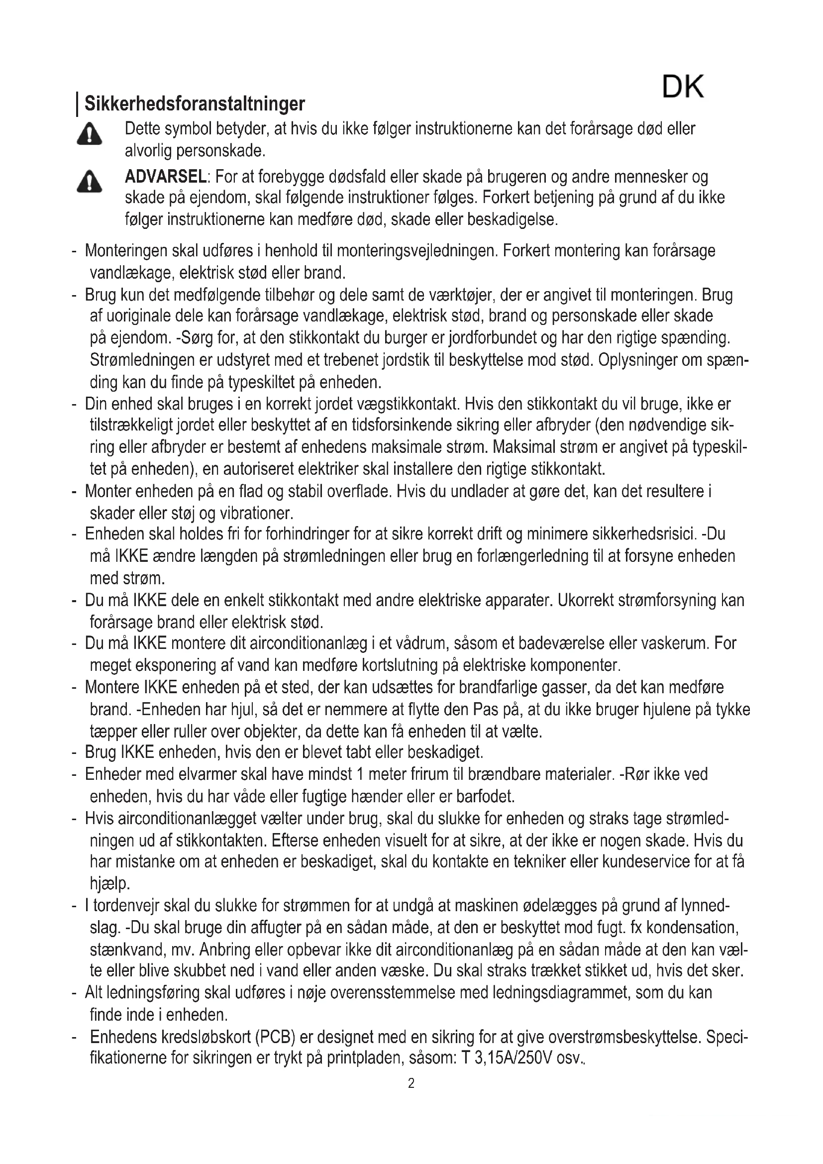 DK2 │Sikkerhedsforanstaltninger Dette symbol betyder, at hvis du ikke følger instruktionerne kan det forårsage død eller alvorlig personskade. ADVARSEL: For at forebygge dødsfald eller skade på brugeren og andre mennesker og skade på ejendom, skal følgende instruktioner følges. Forkert betjening på grund af du ikke følger instruktionerne kan medføre død, skade eller beskadigelse. - Monteringen skal udføres i henhold til monteringsvejledningen. Forkert montering kan forårsage vandlækage, elektrisk stød eller brand. - Brug kun det medfølgende tilbehør og dele samt de værktøjer, der er angivet til monteringen. Brug af uoriginale dele kan forårsage vandlækage, elektrisk stød, brand og personskade eller skade på ejendom. -Sørg for, at den stikkontakt du burger er jordforbundet og har den rigtige spænding. Strømledningen er udstyret med et trebenet jordstik til beskyttelse mod stød. Oplysninger om spæn- ding kan du nde på typeskiltet på enheden. - Din enhed skal bruges i en korrekt jordet vægstikkontakt. Hvis den stikkontakt du vil bruge, ikke er tilstrækkeligt jordet eller beskyttet af en tidsforsinkende sikring eller afbryder (den nødvendige sik- ring eller afbryder er bestemt af enhedens maksimale strøm. Maksimal strøm er angivet på typeskil- tet på enheden), en autoriseret elektriker skal installere den rigtige stikkontakt. - Monter enheden på en ad og stabil overade. Hvis du undlader at gøre det, kan det resultere i skader eller støj og vibrationer. - Enheden skal holdes fri for forhindringer for at sikre korrekt drift og minimere sikkerhedsrisici. -Du må IKKE ændre længden på strømledningen eller brug en forlængerledning til at forsyne enheden med strøm. - Du må IKKE dele en enkelt stikkontakt med andre elektriske apparater. Ukorrekt strømforsyning kan forårsage brand eller elektrisk stød. - Du må IKKE montere dit airconditionanlæg i et vådrum, såsom et badeværelse eller vaskerum. For meget eksponering af vand kan medføre kortslutning på elektriske komponenter. - Montere IKKE enheden på et sted, der kan udsættes for brandfarlige gasser, da det kan medføre brand. -Enheden har hjul, så det er nemmere at ytte den Pas på, at du ikke bruger hjulene på tykke tæpper eller ruller over objekter, da dette kan få enheden til at vælte. - Brug IKKE enheden, hvis den er blevet tabt eller beskadiget. - Enheder med elvarmer skal have mindst 1 meter frirum til brændbare materialer. -Rør ikke ved enheden, hvis du har våde eller fugtige hænder eller er barfodet. - Hvis airconditionanlægget vælter under brug, skal du slukke for enheden og straks tage strømled- ningen ud af stikkontakten. Efterse enheden visuelt for at sikre, at der ikke er nogen skade. Hvis du har mistanke om at enheden er beskadiget, skal du kontakte en tekniker eller kundeservice for at få hjælp. - I tordenvejr skal du slukke for strømmen for at undgå at maskinen ødelægges på grund af lynned- slag. -Du skal bruge din affugter på en sådan måde, at den er beskyttet mod fugt. fx kondensation, stænkvand, mv. Anbring eller opbevar ikke dit airconditionanlæg på en sådan måde at den kan væl- te eller blive skubbet ned i vand eller anden væske. Du skal straks trækket stikket ud, hvis det sker. - Alt ledningsføring skal udføres i nøje overensstemmelse med ledningsdiagrammet, som du kan nde inde i enheden. - Enhedens kredsløbskort (PCB) er designet med en sikring for at give overstrømsbeskyttelse. Speci- kationerne for sikringen er trykt på printpladen, såsom: T 3,15A/250V osv.
