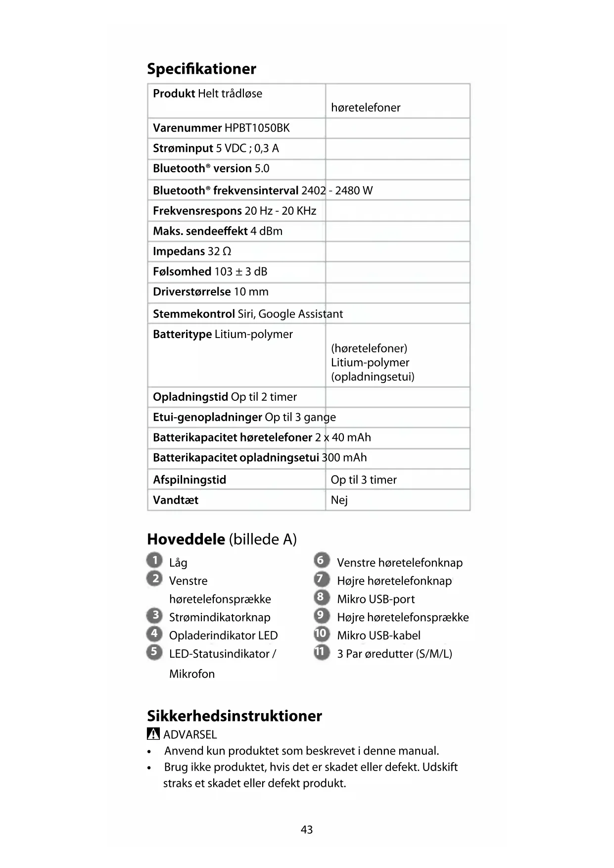 Vejledning til hurtig start Helt trådløse høretelefoner HPBT1050BK Yderligere oplysninger ndes i den udvidede manual online: ned.is/hpbt1050bk Tilsigtet brug Nedis HPBT1050BK er et par helt trådløse høretelefoner. Produktet kan parres med hvilken som helst lyd-/videoenhed med Bluetooth. Høretelefonerne kan oplades op til 3 gange i opladningsetuiet. Enhver modicering af produktet kan have konsekvenser for sikkerhed, garanti og korrekt funktion.43 Specikationer Produkt Helt trådløse høretelefoner Varenummer HPBT1050BK Strøminput 5 VDC ; 0,3 A Bluetooth® version 5.0 Bluetooth® frekvensinterval 2402 - 2480 W Frekvensrespons 20 Hz - 20 KHz Maks. sendeeekt 4 dBm Impedans 32 Ω Følsomhed 103 ± 3 dB Driverstørrelse 10 mm Stemmekontrol Siri, Google Assistant Batteritype Litium-polymer (høretelefoner) Litium-polymer (opladningsetui) Opladningstid Op til 2 timer Etui-genopladninger Op til 3 gange Batterikapacitet høretelefoner 2 x 40 mAh Batterikapacitet opladningsetui 300 mAh Afspilningstid Op til 3 timer Vandtæt Nej Hoveddele (billede A)