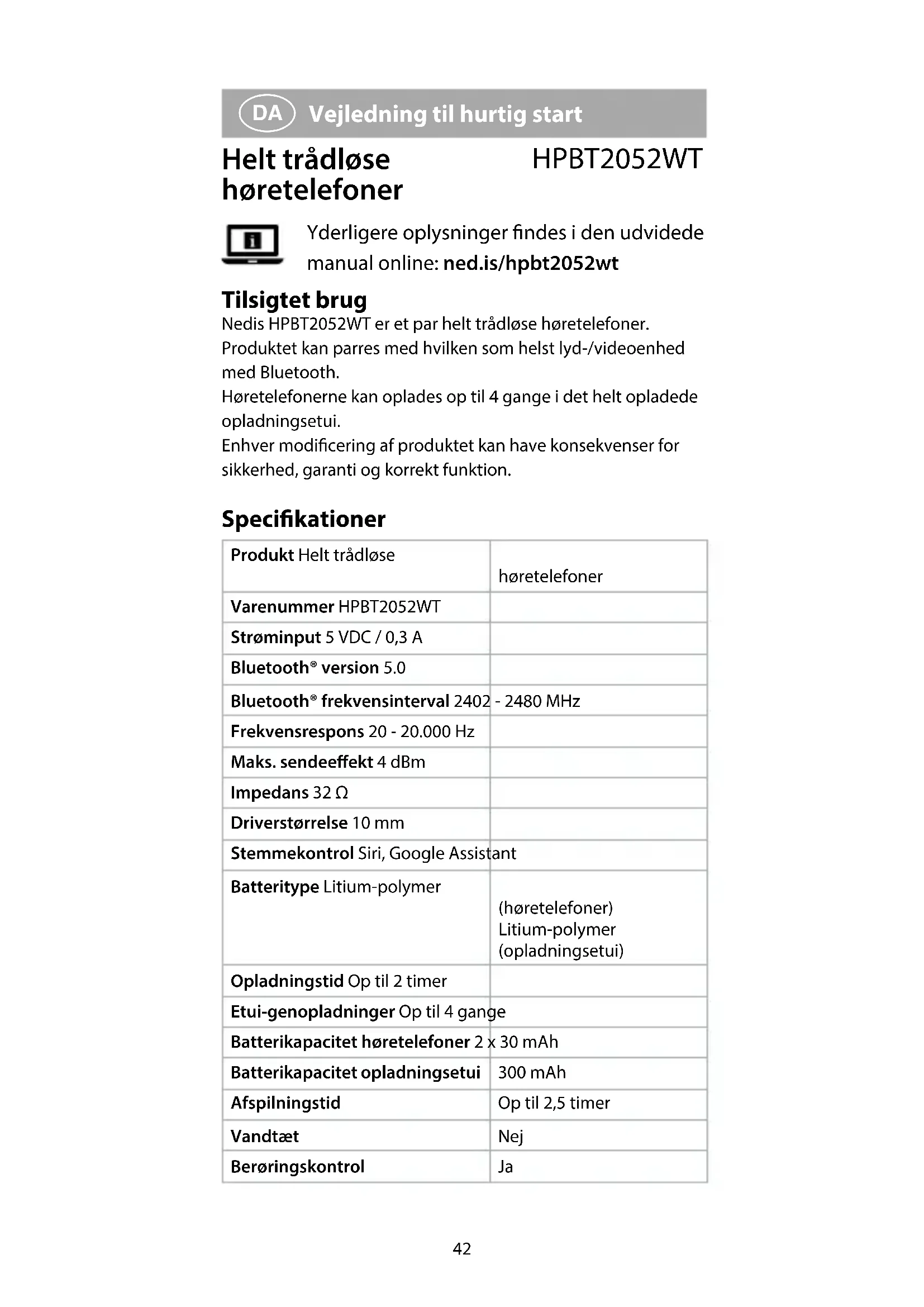 Vejledning til hurtig start Helt trådløse høretelefoner HPBT2052WT Yderligere oplysninger ndes i den udvidede manual online: ned.is/hpbt2052wt Tilsigtet brug Nedis HPBT2052WT er et par helt trådløse høretelefoner. Produktet kan parres med hvilken som helst lyd-/videoenhed med Bluetooth. Høretelefonerne kan oplades op til 4 gange i det helt opladede opladningsetui. Enhver modicering af produktet kan have konsekvenser for sikkerhed, garanti og korrekt funktion. Specikationer Produkt Helt trådløse høretelefoner Varenummer HPBT2052WT Strøminput 5 VDC / 0,3 A Bluetooth® version 5.0 Bluetooth® frekvensinterval 2402 - 2480 MHz Frekvensrespons 20 - 20.000 Hz Maks. sendeeekt 4 dBm Impedans 32 Ω Driverstørrelse 10 mm Stemmekontrol Siri, Google Assistant Batteritype Litium-polymer (høretelefoner) Litium-polymer (opladningsetui) Opladningstid Op til 2 timer Etui-genopladninger Op til 4 gange Batterikapacitet høretelefoner 2 x 30 mAh Batterikapacitet opladningsetui 300 mAh Afspilningstid Op til 2,5 timer Vandtæt Nej Berøringskontrol Ja43 Hoveddele (billede A)