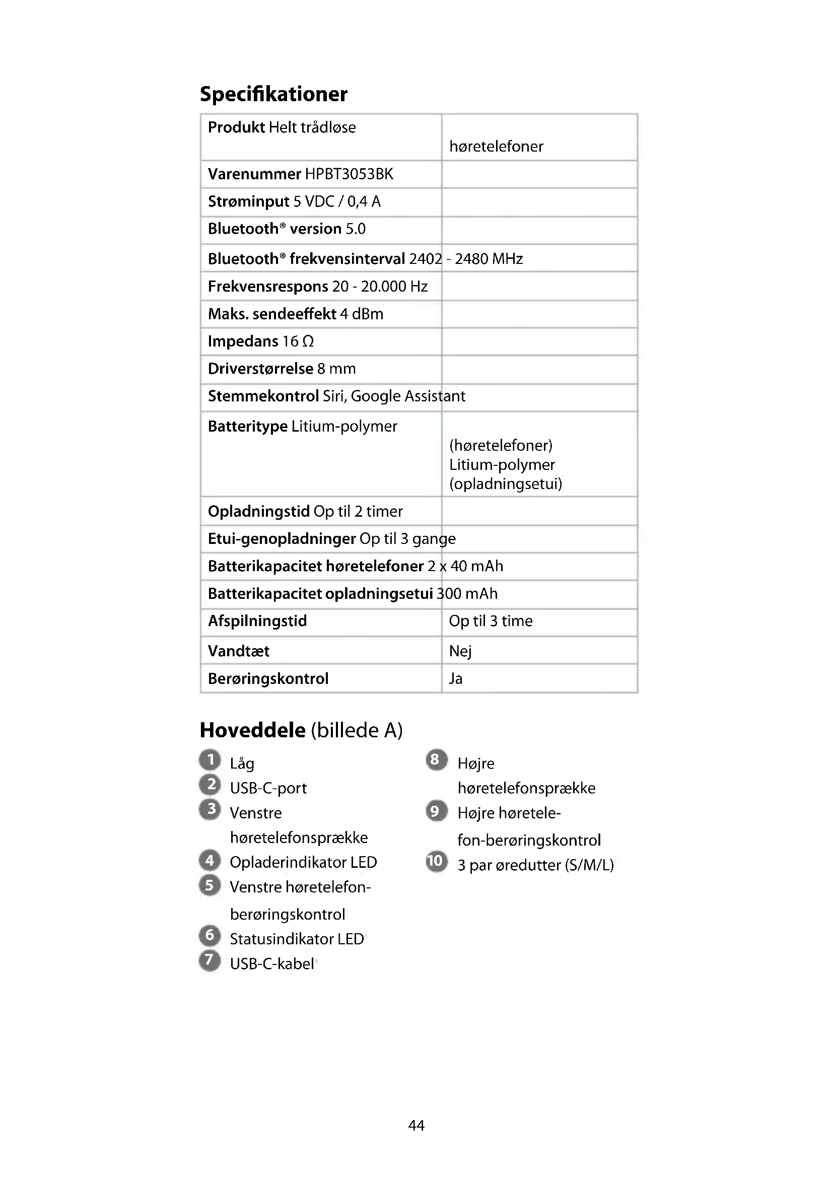 Vejledning til hurtig start Helt trådløse høretelefoner HPBT3053BK Yderligere oplysninger ndes i den udvidede manual online: ned.is/hpbt3053bk Tilsigtet brug Nedis HPBT3053BK er et par helt trådløse høretelefoner.Produktet kan parres med hvilken som helst lyd-/videoenhed med Bluetooth.Høretelefonerne kan oplades op til 3 gange i det helt opladede opladningsetui.Enhver modicering af produktet kan have konsekvenser for sikkerhed, garanti og korrekt funktion.44 Specikationer Produkt Helt trådløse høretelefoner Varenummer HPBT3053BK Strøminput 5 VDC / 0,4 A Bluetooth® version 5.0 Bluetooth® frekvensinterval 2402 - 2480 MHz Frekvensrespons 20 - 20.000 Hz Maks. sendeeekt 4 dBm Impedans 16 Ω Driverstørrelse 8 mm Stemmekontrol Siri, Google Assistant Batteritype Litium-polymer (høretelefoner) Litium-polymer (opladningsetui) Opladningstid Op til 2 timer Etui-genopladninger Op til 3 gange Batterikapacitet høretelefoner 2 x 40 mAh Batterikapacitet opladningsetui 300 mAh Afspilningstid Op til 3 time Vandtæt Nej Berøringskontrol Ja Hoveddele (billede A)