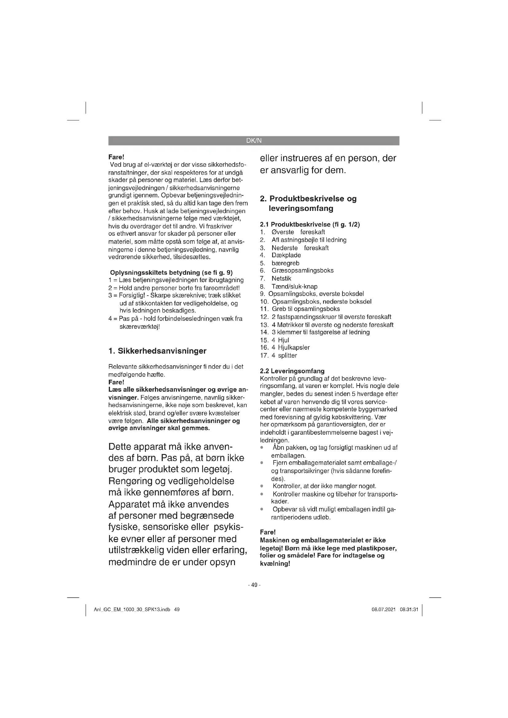 Opbevar så vidt muligt emballagen indtil ga- rantiperiodens udløb. Fare! Maskinen og emballagematerialet er ikke legetøj! Børn må ikke lege med plastikposer, folier og smådele! Fare for indtagelse og kvælning! Anl_GC_EM_1000_30_SPK13.indb 49Anl_GC_EM_1000_30_SPK13.indb 49 08.07.2021 08:31:3108.07.2021 08:31:31DK/N