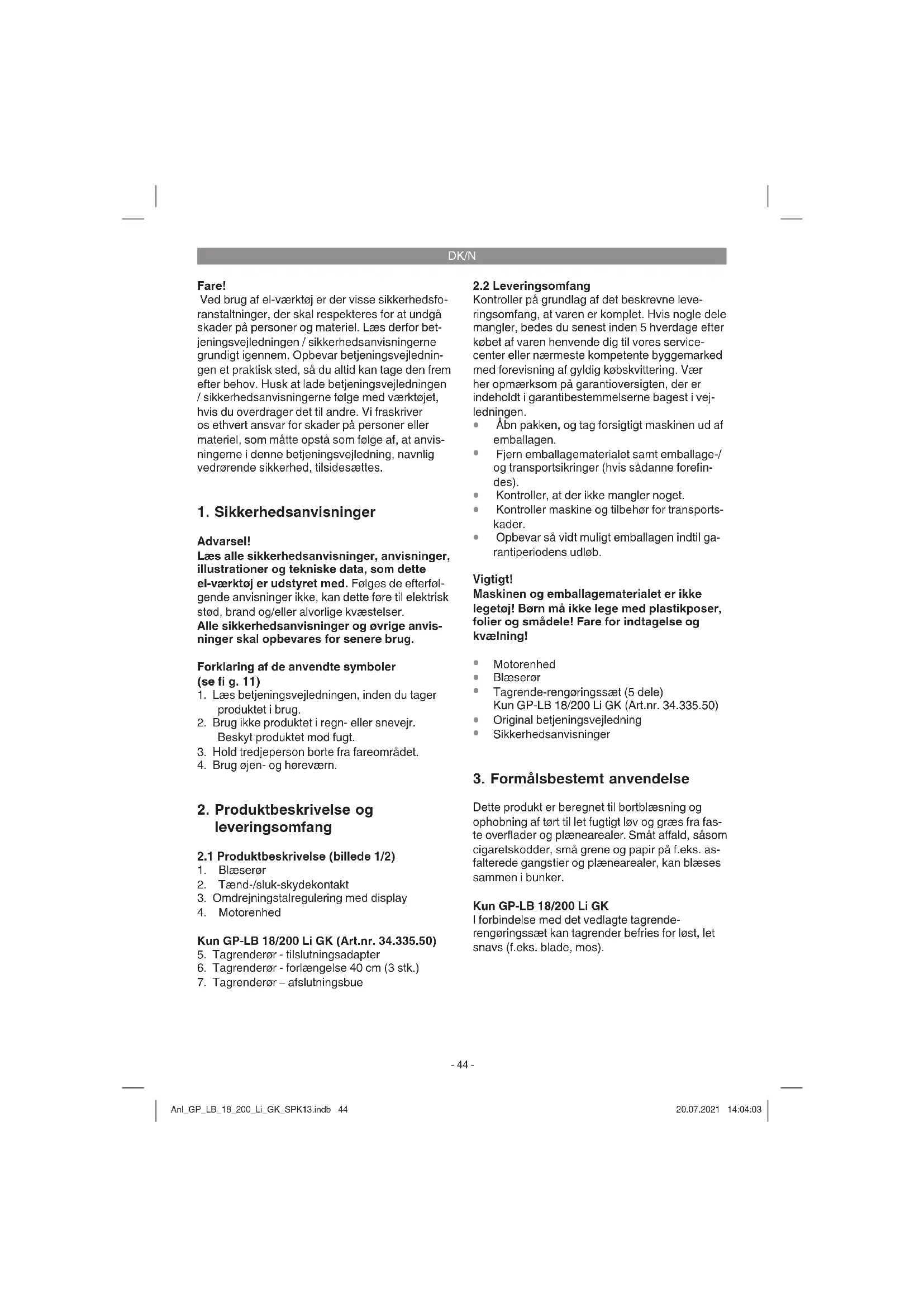 Dette produkt er beregnet til bortblæsning og ophobning af tørt til let fugtigt løv og græs fra fas- te overfl ader og plænearealer. Småt aff ald, såsom cigaretskodder, små grene og papir på f.eks. as- falterede gangstier og plænearealer, kan blæses sammen i bunker. Kun GP-LB 18/200 Li GK I forbindelse med det vedlagte tagrende- rengøringssæt kan tagrender befries for løst, let snavs (f.eks. blade, mos). Anl_GP_LB_18_200_Li_GK_SPK13.indb 44Anl_GP_LB_18_200_Li_GK_SPK13.indb 44 20.07.2021 14:04:0320.07.2021 14:04:03DK/N