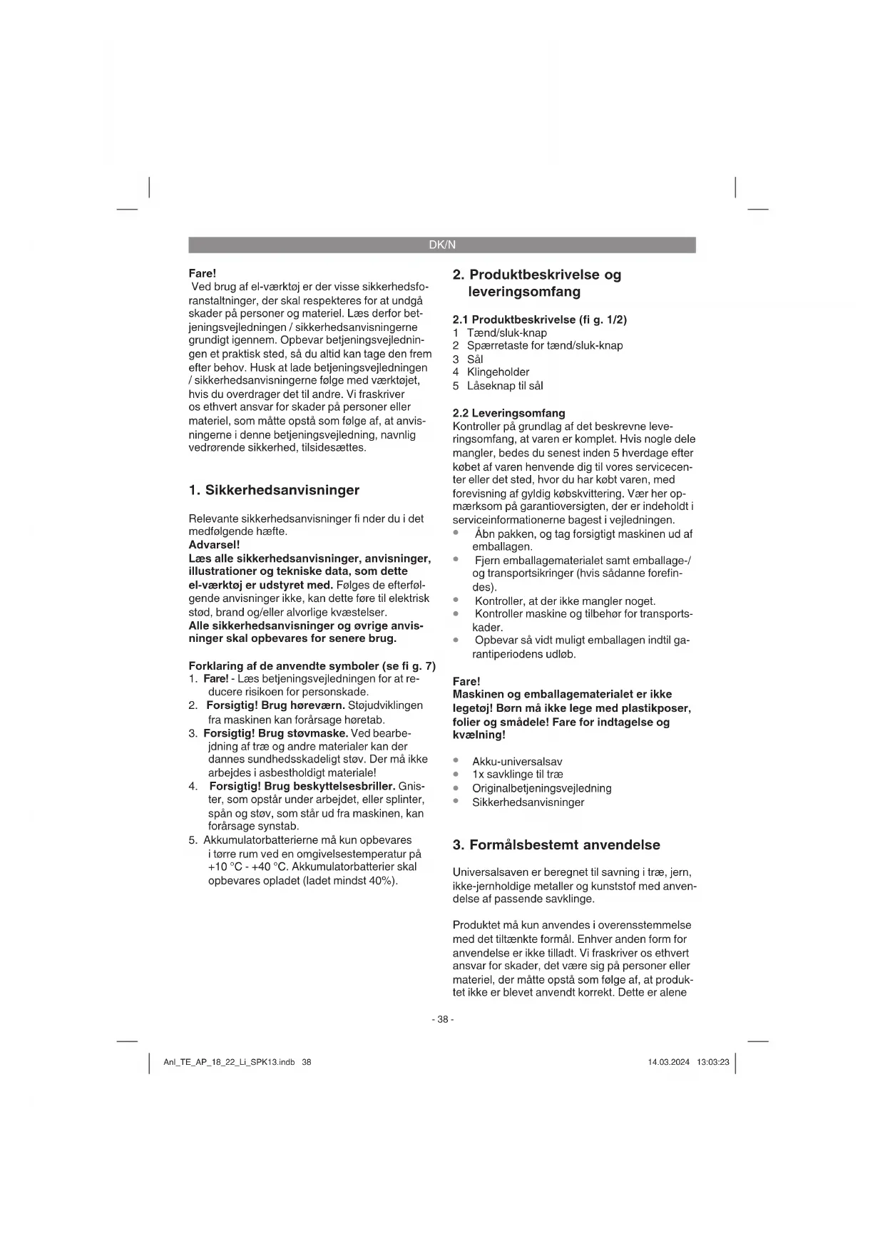 Universalsaven er beregnet til savning i træ, jern, ikke-jernholdige metaller og kunststof med anven- delse af passende savklinge. Produktet må kun anvendes i overensstemmelse med det tiltænkte formål. Enhver anden form for anvendelse er ikke tilladt. Vi fraskriver os ethvert ansvar for skader, det være sig på personer eller materiel, der måtte opstå som følge af, at produk- tet ikke er blevet anvendt korrekt. Dette er alene Anl_TE_AP_18_22_Li_SPK13.indb 38Anl_TE_AP_18_22_Li_SPK13.indb 38 14.03.2024 13:03:2314.03.2024 13:03:23DK/N