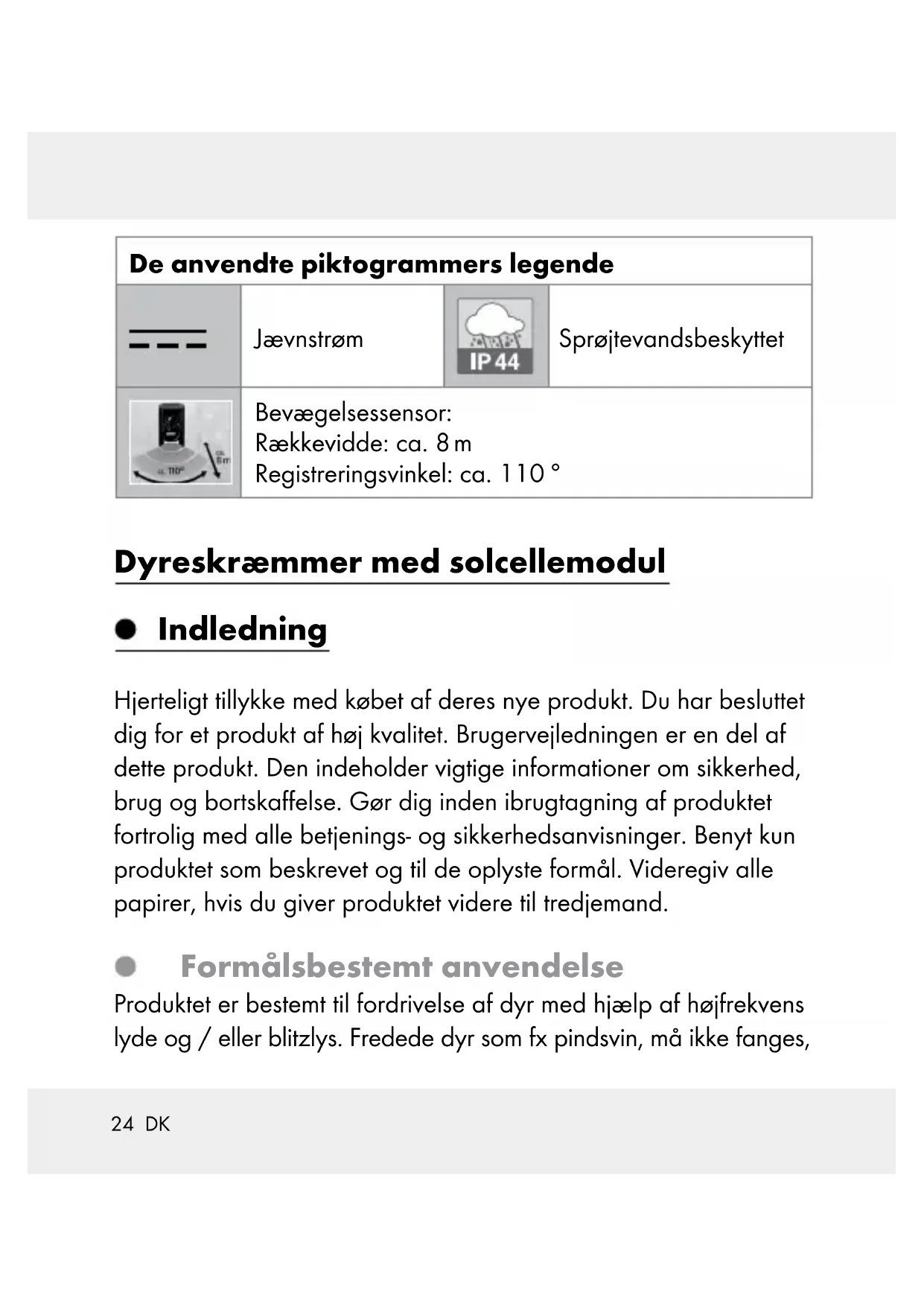 Dyvel Leverede dele 1 dyreskræmmer med solcellepanel 1 USB-ladekabel 1 jordspyd (to-delt) 3 akkumulatorer (AA, Ni-MH, hver 800 mAh) 1 dyvel (Ø 6 mm) 1 fastgørelsesskrue (3,8 x 30 mm) 1 betjeningsvejledning27 DK Tekniske data Driftspænding: 3,6 V Akkumulatorer: 3 x Ni-MH-akkumulator / AA / 1,2 V / 800 mAh Beskyttelsesklasse: III / Beskyttelsesart: IP44 (sprøjtevandsbeskyttet) Signalfrekvenser: ca. 13,5 kHz–23,5 kHz DC-Ladebøsning: 5 V , max. 500 mA Jævnstrøm- nettilslutningens polaritet: Bevægelsessensor: Rækkevidde: ca. 8 m Registreringsvinkel: ca. 110 ° Sikkerhedshenvisninger Gør Dem fortrolig med alle betjenings- og sikkerhedshenvisninger, inden produktet tages i brug første gang! Hvis De giver produktet videre til tredjemand, skal alt materiale også følge med! Dette produkt kan benyttes af børn fra 8-årsalderen og opad, samt af personer med forringede fysiske, følelsesmæssige eller mentale evner eller med28 DK mangel på erfaring og viden, når de er under opsyn eller er blevet vejledt med hensyn til produktet og forstår de deraf resul- terende farer. Børn må ikke lege med produktet. Rengøring og brugervedligeholdelse må ikke udføres af børn uden at være under opsyn. Tag produktet ikke i brug, når De konstaterer nogen form for beskadigelse. Sørg for at solfangeren ikke er tilsnavset eller dækket af sne og is om vinteren. Dette forringer solfangerens effektivitet. Stil ikke genstande på produktet! Hold flammer på afstand af produktet! Hvis produktet giver usædvanlige lyde fra sig, hvis du konstaterer en røgudvikling ved produktet eller hvis lignende forstyrrelser optræder, fjern omgående de indbyggede batterier og / eller afbryd forbindelsen til USB-opladningskablet. Driv produktet udelukkende udenfor mennerskers rækkevidde hvor de kan høre det. Produktet udsender frekvenser, som også af mennesker kan varetages som forstyrrende og ubehagelige. Sikkerhedshenvisninger for batterier / akkuer LIVSFARE! Hold batterier / akkuer udenfor børns rækkevidde. Opsøg i tilfælde af slugning straks lægehjælp!29 DK EKSPLOSIONSFARE! Genoplad aldrig ikkeop- ladelige batterier igen. Kortslut ikke batterier / akkuer og / eller åben disse ikke. Der kan opstå overophed- ning, brandfare eller eksplosion. Smid batterier / akkuer aldrig i ild eller vand. Udsæt batterier / akkuer ikke for mekanisk belastning. Risiko for udsivning fra batteriene / akkuerne Undgå ekstreme betingelser og temperaturer, som kan påvirke batterier / akkuer, f.eks. varmelegemer / direkte sollys. Hvis batterier / akkuer er lækket, skal du undgå at få kemika- lierne på huden, i øjnene og i slimhinderne! Skyl de berørte steder med det samme med klart vand og opsøg en læge! BÆR BESKYTTELSESHANDSKER! Udløbne eller beskadigede batterier / akkuer kan forårsage ætsnin- ger ved berøring med huden. Bær i dette tilfælde derfor egnede beskyttelseshandsker. I tilfælde af en lækage hos batterierne / akkuerne, skal De fjerne disse med det samme fra produktet for at undgå beskadigelser. Anvend kun batterier / akkuer af samme type. Bland ikke gamle batterier / akkuer med nye! Fjern batterierne / akkuerne, når produktet ikke anvendes i en længere periode.30 DK Risiko for beskadigelse af produktet Anvend udelukkende den angivne batteri- / akkutype! Indsæt batterier / akkuer iht. polaritetsmærkningen (+) og (-) til batteri / akku og produktet. Rengør kontakter ved batteri / akku og i batterirummet inden ilægningen! Fjern brugte batterier / akkuer omgående fra produktet. Inden ibrugtagningen Henvisning: fjern alt emballage fra produktet. Henvisning: sæt først akkumulatorerne ind i produktet. Udskiftning / ilægning af akkumulatorer Indsæt, henholdsvis udskift akkumulatorerne når produktets drifttid, trods godt sollys, efter nogen tid aftager betragteligt. Åben til udskiftningen af akkumulatorerne