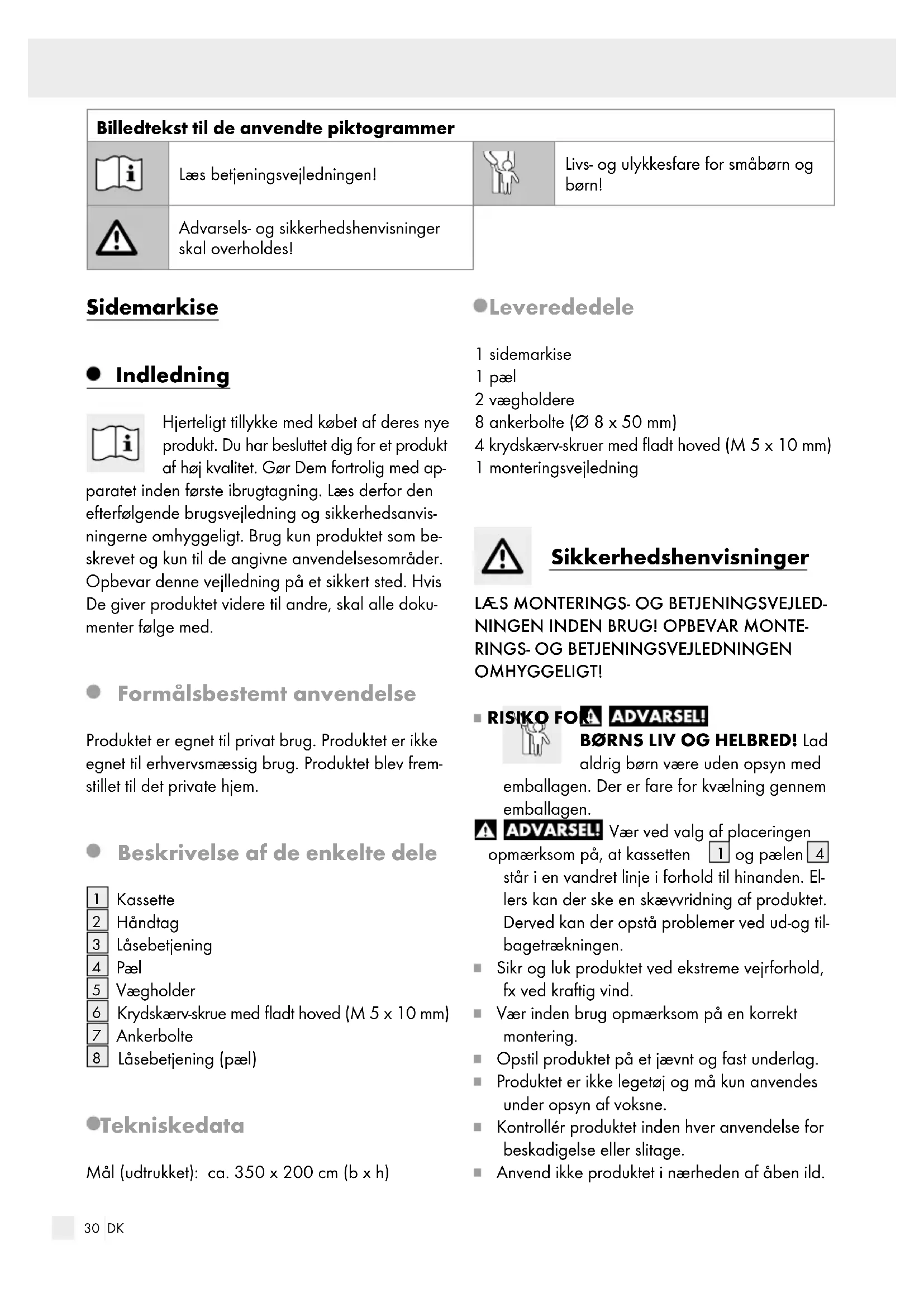 Låsebetjening (pæl) Tekniske data Mål (udtrukket): ca. 350 x 200 cm (b x h) Leverede dele 1 sidemarkise 1 pæl 2 vægholdere 8 ankerbolte (Ø 8 x 50 mm) 4 krydskærv-skruer med fladt hoved (M 5 x 10 mm) 1 monteringsvejledning Sikkerhedshenvisninger