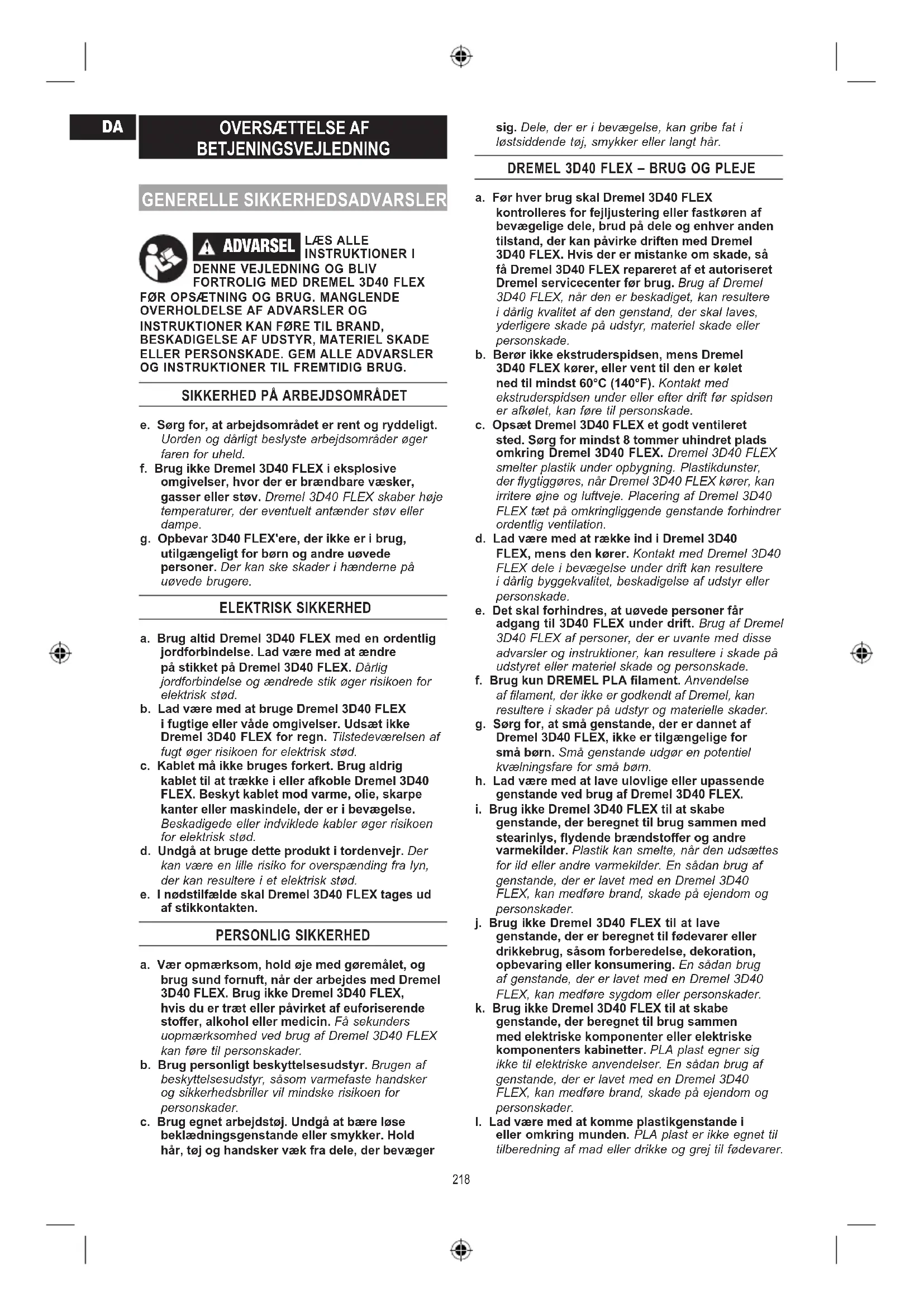 e. Sørg for, at arbejdsområdet er rent og ryddeligt. Uorden og dårligt beslyste arbejdsområder øger faren for uheld. f. Brug ikke Dremel 3D40 FLEX i eksplosive omgivelser, hvor der er brændbare væsker, gasser eller støv. Dremel 3D40 FLEX skaber høje temperaturer, der eventuelt antænder støv eller dampe. g. Opbevar 3D40 FLEX'ere, der ikke er i brug, utilgængeligt for børn og andre uøvede personer. Der kan ske skader i hænderne på uøvede brugere. ELEKTRISK SIKKERHED a. Brug altid Dremel 3D40 FLEX med en ordentlig jordforbindelse. Lad være med at ændre på stikket på Dremel 3D40 FLEX. Dårlig jordforbindelse og ændrede stik øger risikoen for elektrisk stød. b. Lad være med at bruge Dremel 3D40 FLEX i fugtige eller våde omgivelser. Udsæt ikke Dremel 3D40 FLEX for regn. Tilstedeværelsen af fugt øger risikoen for elektrisk stød. c. Kablet må ikke bruges forkert. Brug aldrig kablet til at trække i eller afkoble Dremel 3D40 FLEX. Beskyt kablet mod varme, olie, skarpe kanter eller maskindele, der er i bevægelse. Beskadigede eller indviklede kabler øger risikoen for elektrisk stød. d. Undgå at bruge dette produkt i tordenvejr. Der kan være en lille risiko for overspænding fra lyn, der kan resultere i et elektrisk stød. e. I nødstilfælde skal Dremel 3D40 FLEX tages ud af stikkontakten. PERSONLIG SIKKERHED a. Vær opmærksom, hold øje med gøremålet, og brug sund fornuft, når der arbejdes med Dremel 3D40 FLEX. Brug ikke Dremel 3D40 FLEX, hvis du er træt eller påvirket af euforiserende stoer, alkohol eller medicin. Få sekunders uopmærksomhed ved brug af Dremel 3D40 FLEX kan føre til personskader. b. Brug personligt beskyttelsesudstyr. Brugen af beskyttelsesudstyr, såsom varmefaste handsker og sikkerhedsbriller vil mindske risikoen for personskader. c. Brug egnet arbejdstøj. Undgå at bære løse beklædningsgenstande eller smykker. Hold hår, tøj og handsker væk fra dele, der bevæger sig. Dele, der er i bevægelse, kan gribe fat i løstsiddende tøj, smykker eller langt hår.