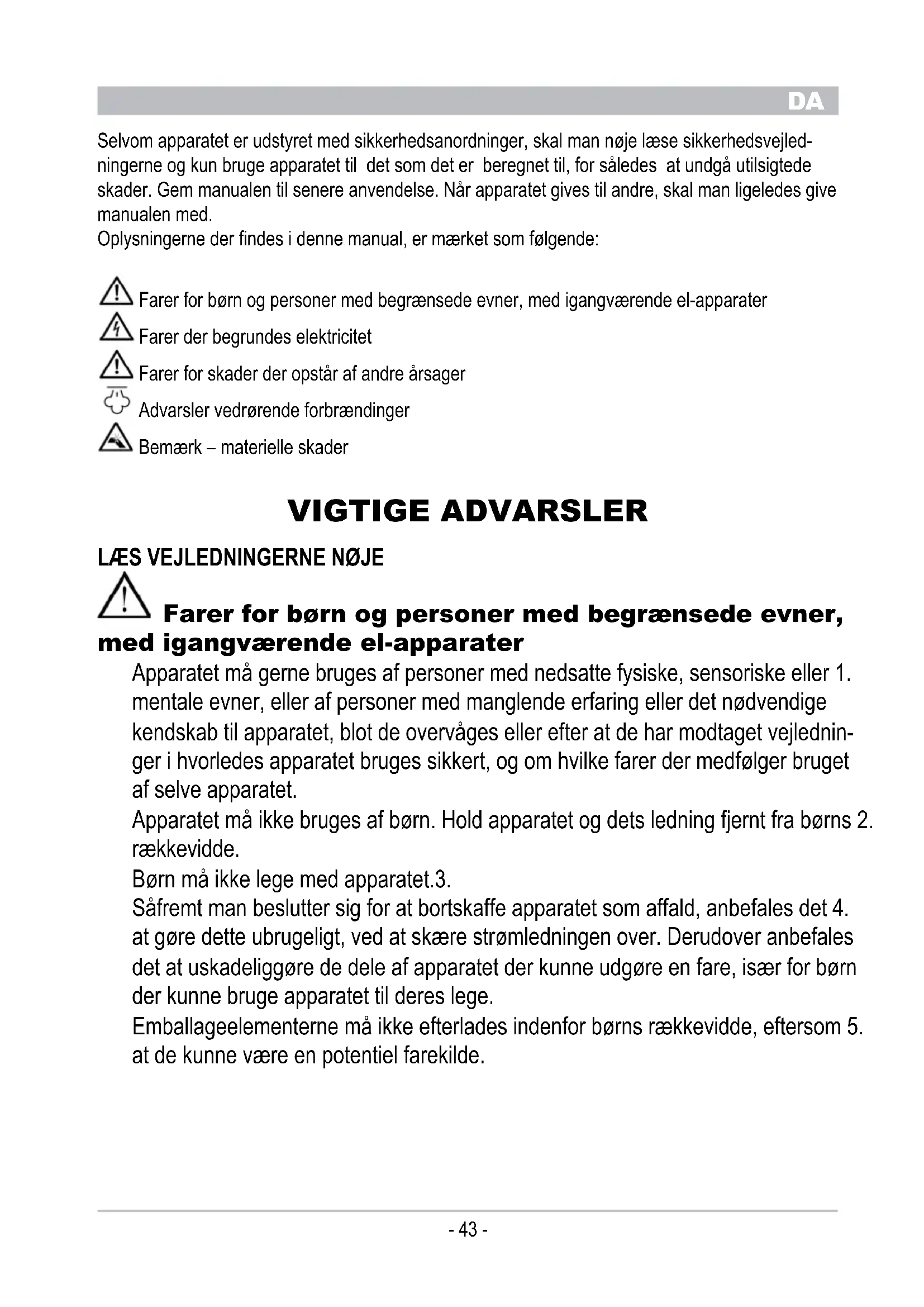 Selvom apparatet er udstyret med sikkerhedsanordninger, skal man nøje læse sikkerhedsvejled- ningerne og kun bruge apparatet til det som det er beregnet til, for således at undgå utilsigtede skader. Gem manualen til senere anvendelse. Når apparatet gives til andre, skal man ligeledes give manualen med. Oplysningerne der findes i denne manual, er mærket som følgende: Farer for børn og personer med begrænsede evner, med igangværende el-apparater Farer der begrundes elektricitet Farer for skader der opstår af andre årsager Advarsler vedrørende forbrændinger Bemærk – materielle skader VIGTIGE ADVARSLER lÆs vEJlEDNINGERNE NØJE Farer for børn og personer med begrænsede evner, med igangværende el-apparater Apparatet må gerne bruges af personer med nedsatte fysiske, sensoriske eller 1. mentale evner, eller af personer med manglende erfaring eller det nødvendige kendskab til apparatet, blot de overvåges eller efter at de har modtaget vejlednin- ger i hvorledes apparatet bruges sikkert, og om hvilke farer der medfølger bruget af selve apparatet. Apparatet må ikke bruges af børn. Hold apparatet og dets ledning fjernt fra børns 2. rækkevidde. Børn må ikke lege med apparatet.3. Såfremt man beslutter sig for at bortskaffe apparatet som affald, anbefales det 4. at gøre dette ubrugeligt, ved at skære strømledningen over. Derudover anbefales det at uskadeliggøre de dele af apparatet der kunne udgøre en fare, især for børn der kunne bruge apparatet til deres lege. Emballageelementerne må ikke efterlades indenfor børns rækkevidde, eftersom 5. at de kunne være en potentiel farekilde.DA