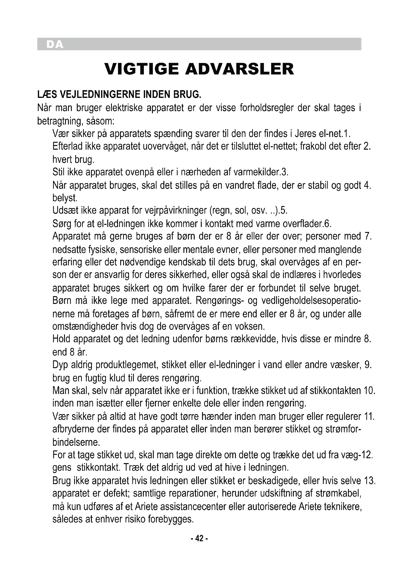 VIGTIGE ADVARSLER LÆS VEJLEDNINGERNE INDEN BRUG. Når man bruger elektriske apparatet er der visse forholdsregler der skal tages i betragtning, såsom: Vær sikker på apparatets spænding svarer til den der findes i Jeres el-net.1. Efterlad ikke apparatet uovervåget, når det er tilsluttet el-nettet; frakobl det efter 2. hvert brug. Stil ikke apparatet ovenpå eller i nærheden af varmekilder.3. Når apparatet bruges, skal det stilles på en vandret flade, der er stabil og godt 4. belyst. Udsæt ikke apparat for vejrpåvirkninger (regn, sol, osv. ..).5. Sørg for at el-ledningen ikke kommer i kontakt med varme overflader.6. Apparatet må gerne bruges af børn der er 8 år eller der over; personer med 7. nedsatte fysiske, sensoriske eller mentale evner, eller personer med manglende erfaring eller det nødvendige kendskab til dets brug, skal overvåges af en per- son der er ansvarlig for deres sikkerhed, eller også skal de indlæres i hvorledes apparatet bruges sikkert og om hvilke farer der er forbundet til selve bruget. Børn må ikke lege med apparatet. Rengørings- og vedligeholdelsesoperatio- nerne må foretages af børn, såfremt de er mere end eller er 8 år, og under alle omstændigheder hvis dog de overvåges af en voksen. Hold apparatet og det ledning udenfor børns rækkevidde, hvis disse er mindre 8. end 8 år. Dyp aldrig produktlegemet, stikket eller el-ledninger i vand eller andre væsker, 9. brug en fugtig klud til deres rengøring. Man skal, selv når apparatet ikke er i funktion, trække stikket ud af stikkontakten 10. inden man isætter eller fjerner enkelte dele eller inden rengøring. Vær sikker på altid at have godt tørre hænder inden man bruger eller regulerer 11. afbryderne der findes på apparatet eller inden man berører stikket og strømfor- bindelserne. For at tage stikket ud, skal man tage direkte om dette og trække det ud fra væg-12. gens stikkontakt. Træk det aldrig ud ved at hive i ledningen. Brug ikke apparatet hvis ledningen eller stikket er beskadigede, eller hvis selve 13. apparatet er defekt; samtlige reparationer, herunder udskiftning af strømkabel, må kun udføres af et Ariete assistancecenter eller autoriserede Ariete teknikere, således at enhver risiko forebygges.DA