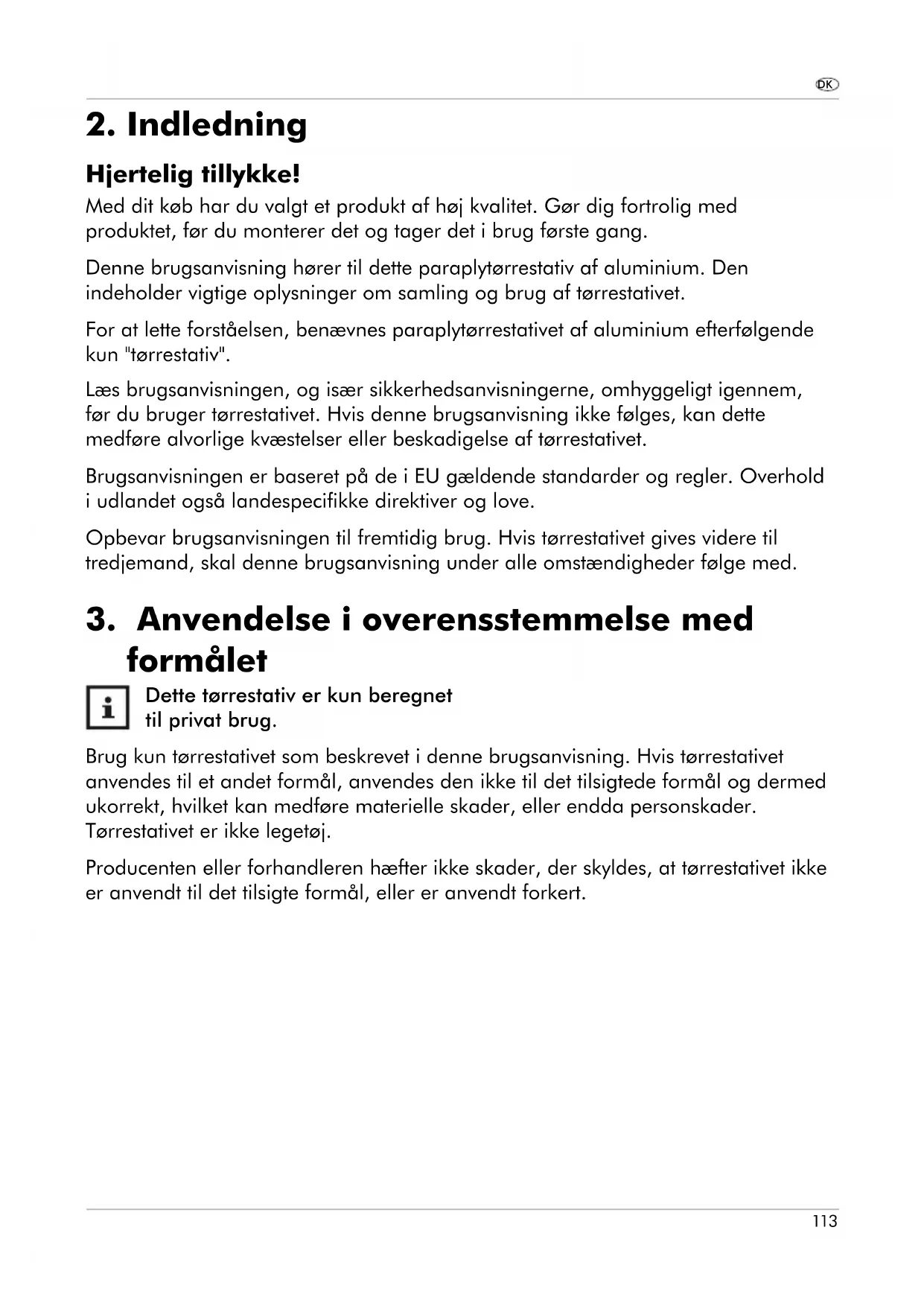 Dette tørrestativ er kun beregnet til privat brug. Brug kun tørrestativet som beskrevet i denne brugsanvisning. Hvis tørrestativet anvendes til et andet formål, anvendes den ikke til det tilsigtede formål og dermed ukorrekt, hvilket kan medføre materielle skader, eller endda personskader. Tørrestativet er ikke legetøj. Producenten eller forhandleren hæfter ikke skader, der skyldes, at tørrestativet ikke er anvendt til det tilsigte formål, eller er anvendt forkert.114