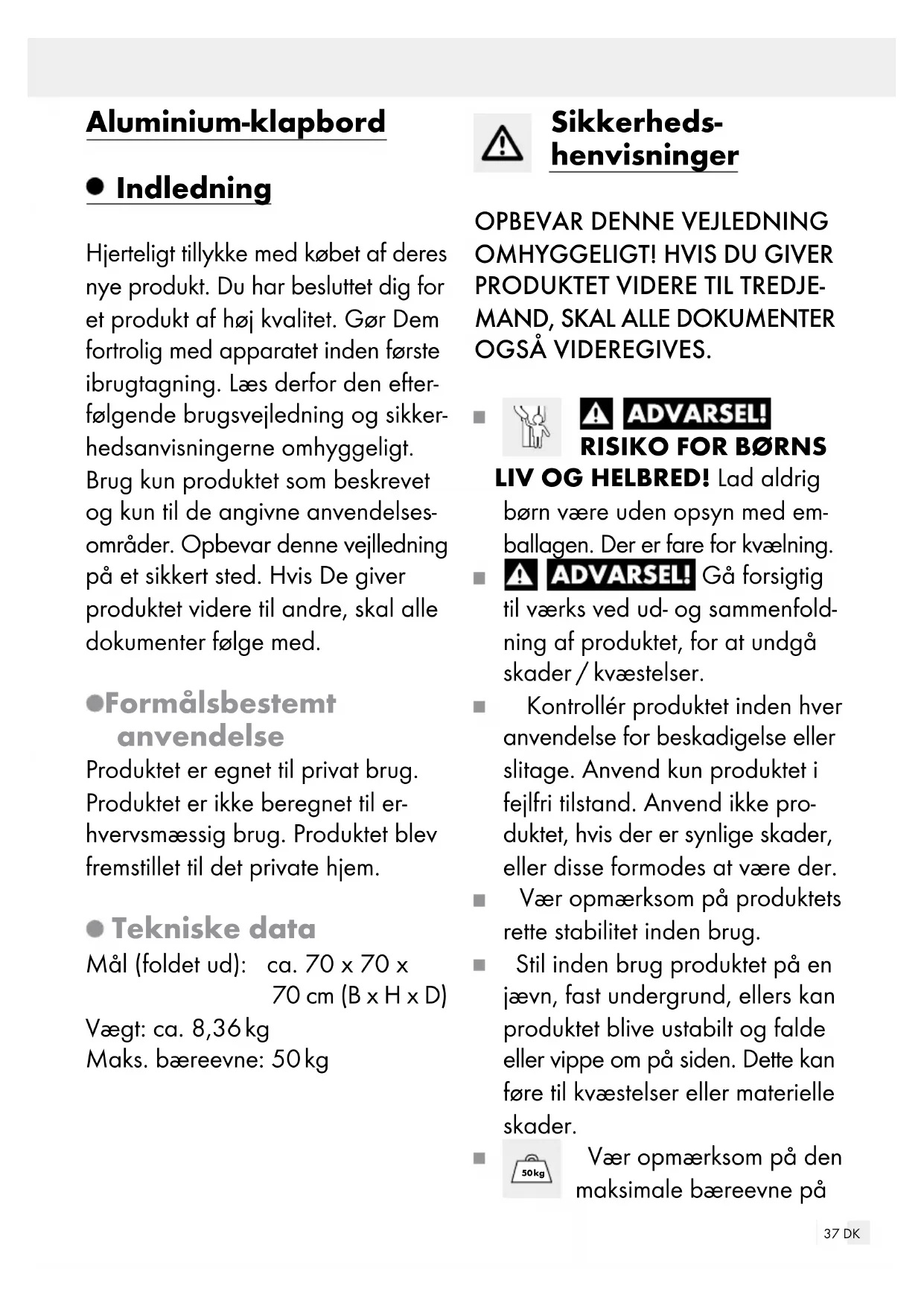 LIV OG HELBRED! Lad aldrig børn være uden opsyn med em- ballagen. Der er fare for kvælning. Gå forsigtig til værks ved ud- og sammenfold- ning af produktet, for at undgå skader / kvæstelser. Kontrollér produktet inden hver anvendelse for beskadigelse eller slitage. Anvend kun produktet i fejlfri tilstand. Anvend ikke pro- duktet, hvis der er synlige skader, eller disse formodes at være der. Vær opmærksom på produktets rette stabilitet inden brug. Stil inden brug produktet på en jævn, fast undergrund, ellers kan produktet blive ustabilt og falde eller vippe om på siden. Dette kan føre til kvæstelser eller materielle skader. 50 kg Vær opmærksom på den maksimale bæreevne på38 DK 50 kg. Hvis denne vægtgrænse overskrides, kan dette føre til personskader og / eller materi- elle skader. Sørg for, at personer, især børn, ikke stiller sig på produktet eller trækker sig op ved hjælp af det. Produktet kan vælte omkuld. Sæt eller stil dig aldrig på pro- duktet. Pas for at undgå skader på at dine hænder ikke kommer ind i sammenklapningsanordningen. Vær ved udfoldningen opmærk- som på, at foldemekanismen går i hak, inden du anvender produktet. Sørg for at produktet er blevet fuldstændig åbnet, inden du anvender det. Produktet er ikke noget legetøj og bør kun anvendes under opsyn af voksne. Produktet er ikke noget klatrestativ eller legetøj. Sikre produktet ved ekstreme vejrforhold, fx ved kraftig blæst. Anvend aldrig produktet i nær- heden af åben ild.