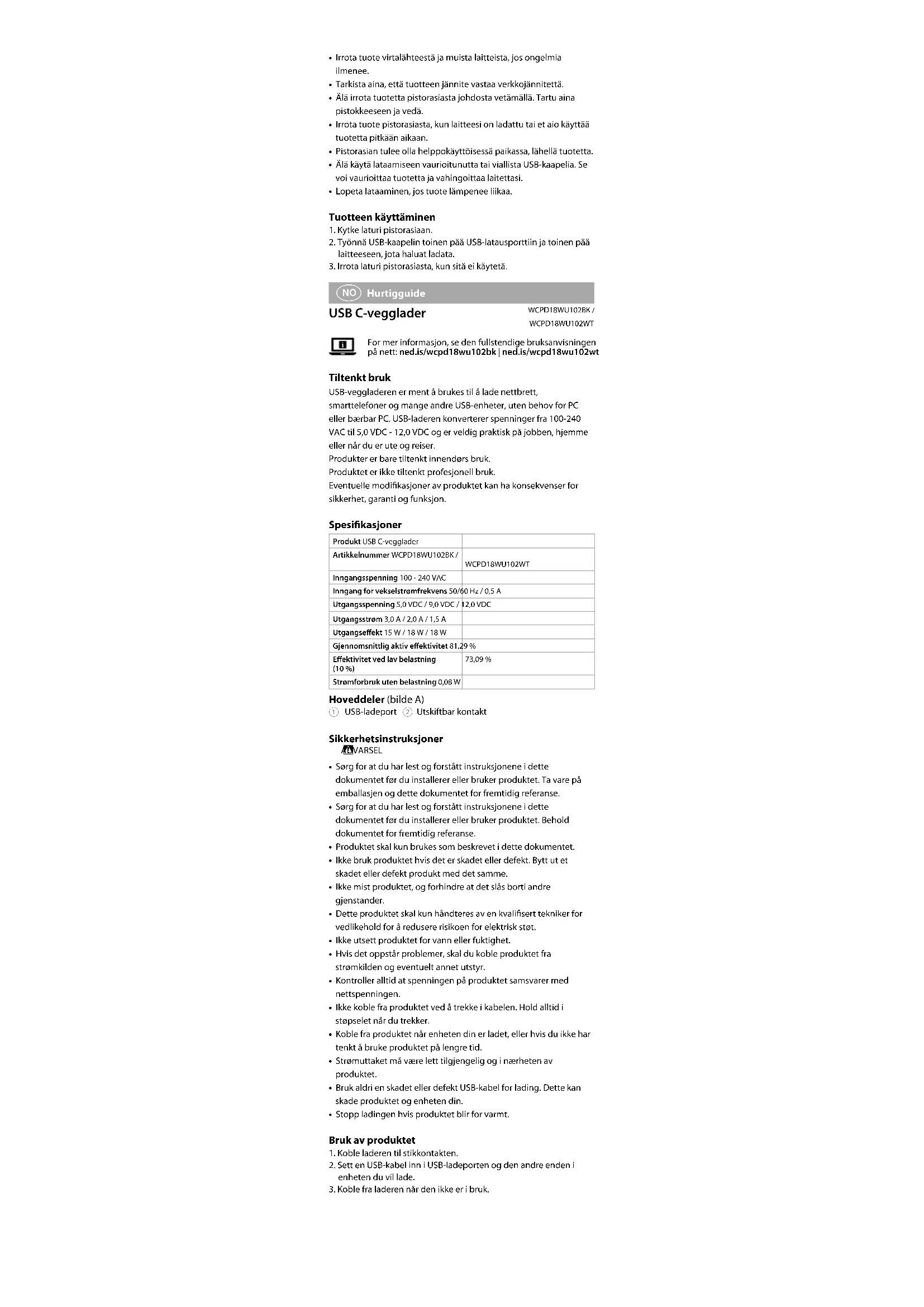 Yderligere oplysninger ndes i den udvidede manual online: ned.is/wcpd18wu102bk | ned.is/wcpd18wu102wt Tilsigtet brug USB-vægopladeren er beregnet til at oplade tablets, smartphones og mange andre USB-enheder, uden brug for en PC eller bærbar computer. USB-opladeren omdanner spændinger fra 100 til 240 V AC til 5,0 V DC - 12,0 VDC og er meget praktisk på kontorer, derhjemme eller under rejser. Produktet er kun beregnet til indendørs brug. Dette produkt er ikke beregnet til professionel brug. Enhver modicering af produktet kan have konsekvenser for sikkerhed, garanti og korrekt funktion. Specikationer Produkt USB-C-vægopladerVarenummer WCPD18WU102BK / WCPD18WU102WTIndgangsspænding 100 - 240 VACInput AC-frekvens 50/60 Hz / 0,5 AUdgangsspænding 5,0 V DC / 9,0 V DC / 12,0 V DCUdgangsstrøm 3,0 A / 2,0 A / 1,5 AUdgangsstrøm 15 W / 18 W / 18 WGennemsnitlig aktiv frekvens 81,29 %Eektivitet ved lav belastning (10 %)73,09 %Strømforbrug ved tomgang 0,08 W Hoveddele (billede A) 1 USB-opladerport 2 Udskifteligt stik Sikkerhedsinstruktioner