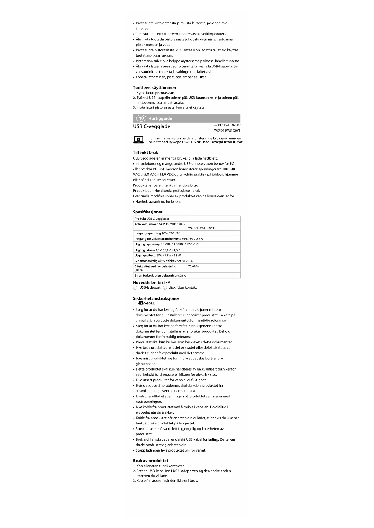 Yderligere oplysninger ndes i den udvidede manual online: ned.is/wcpd18wu102bk | ned.is/wcpd18wu102wt Tilsigtet brug USB-vægopladeren er beregnet til at oplade tablets, smartphones og mange andre USB-enheder, uden brug for en PC eller bærbar computer. USB-opladeren omdanner spændinger fra 100 til 240 V AC til 5,0 V DC - 12,0 VDC og er meget praktisk på kontorer, derhjemme eller under rejser. Produktet er kun beregnet til indendørs brug. Dette produkt er ikke beregnet til professionel brug. Enhver modicering af produktet kan have konsekvenser for sikkerhed, garanti og korrekt funktion. Specikationer Produkt USB-C-vægopladerVarenummer WCPD18WU102BK / WCPD18WU102WTIndgangsspænding 100 - 240 VACInput AC-frekvens 50/60 Hz / 0,5 AUdgangsspænding 5,0 V DC / 9,0 V DC / 12,0 V DCUdgangsstrøm 3,0 A / 2,0 A / 1,5 AUdgangsstrøm 15 W / 18 W / 18 WGennemsnitlig aktiv frekvens 81,29 %Eektivitet ved lav belastning (10 %)73,09 %Strømforbrug ved tomgang 0,08 W Hoveddele (billede A) 1 USB-opladerport 2 Udskifteligt stik Sikkerhedsinstruktioner