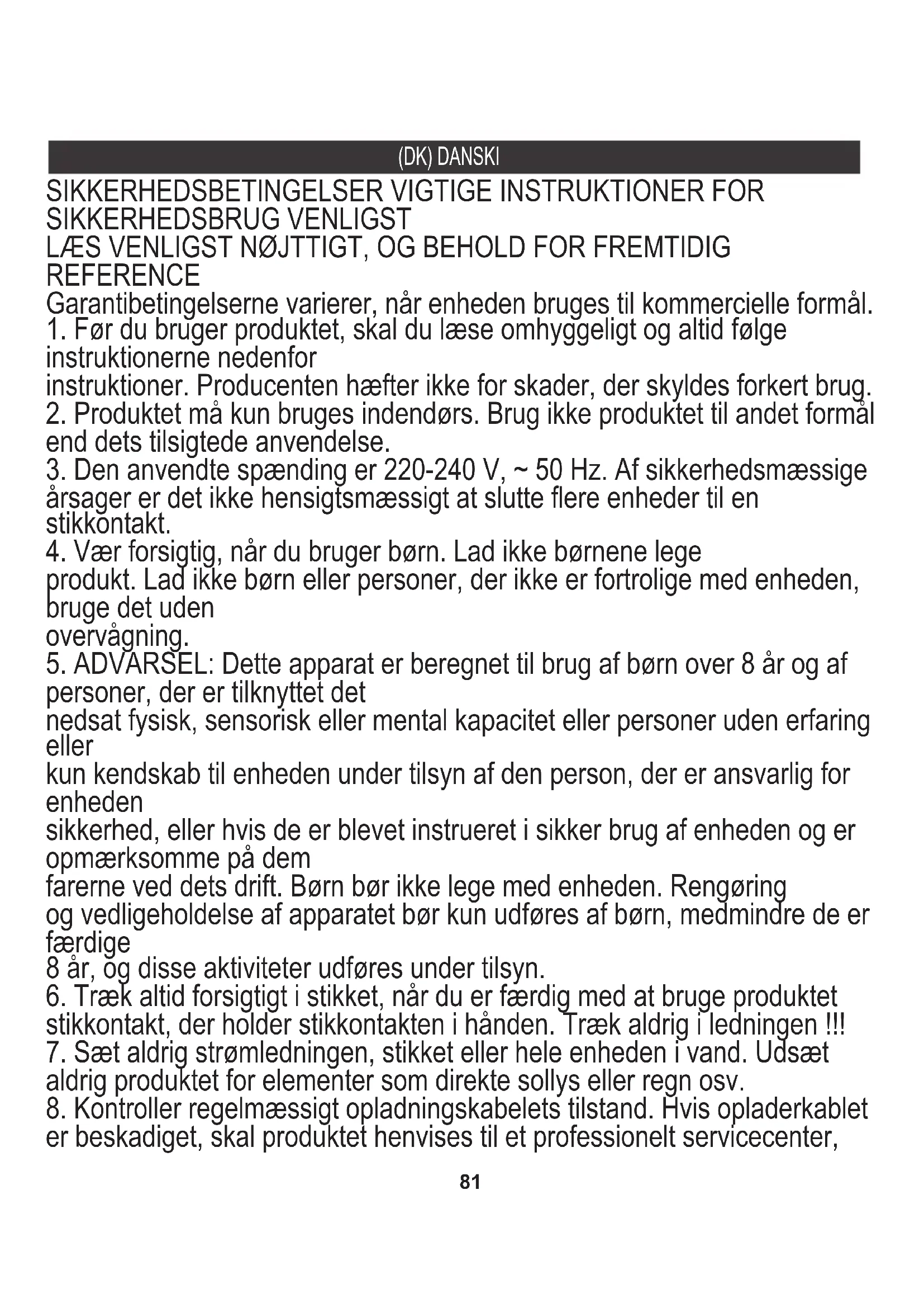 5. ADVARSEL: Dette apparat er beregnet til brug af børn over 8 år og af