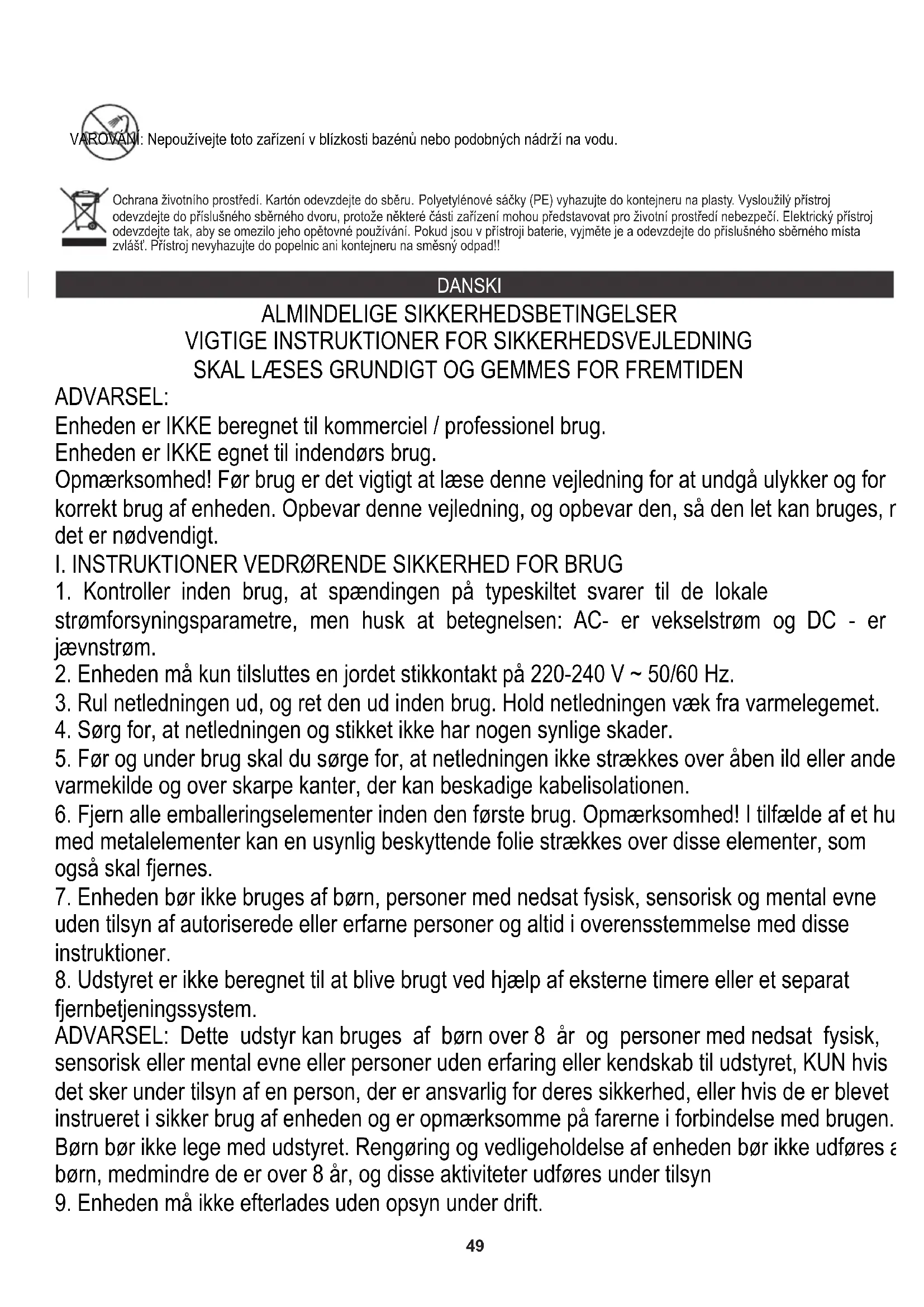 SKAL LÆSES GRUNDIGT OG GEMMES FOR FREMTIDEN ADVARSEL: Enheden er IKKE beregnet til kommerciel / professionel brug. Enheden er IKKE egnet til indendørs brug. Opmærksomhed! Før brug er det vigtigt at læse denne vejledning for at undgå ulykker og for korrekt brug af enheden. Opbevar denne vejledning, og opbevar den, så den let kan bruges, når det er nødvendigt.