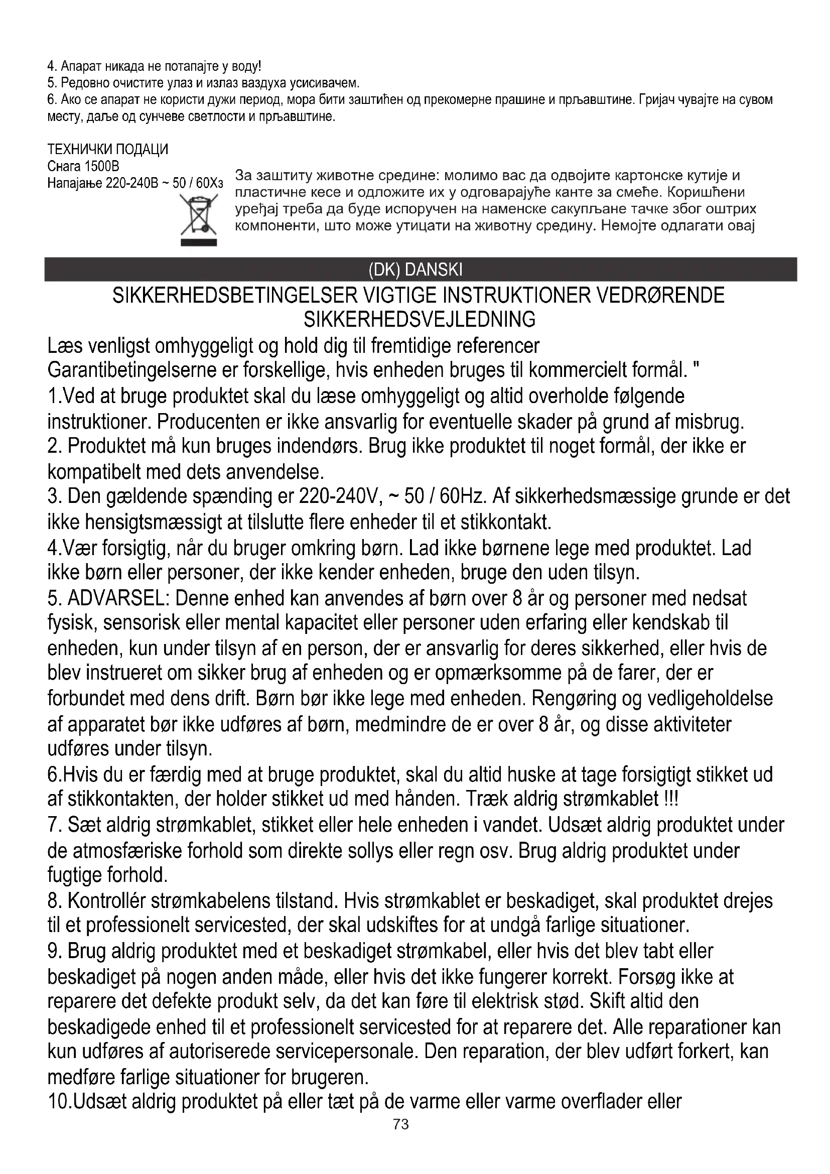 autoriserede forhandler til din kundeserviceafdeling. 3.Rør ikke ved eller tildæk luftudtaget under brug. Dette kan få enheden til at blive overophedet, og sikkerhedsanordningen kan fungere.76 Af hensyn til miljøet . Venligst overfør papemballage til affaldspapir. Hæld polyethylenposer (PE) i plastbeholderen Slidt enhed skal returneres til det relevante punkt opbevaring, fordi det er farligt i enheden ingredienser kan udgøre en trussel for miljøet. Den elektriske enhed skal overleveres for at begrænse dets genanvendelse og brug. Hvis i enheden der er batterier, fjern dem og vende tilbage til punktet opbevares separat.