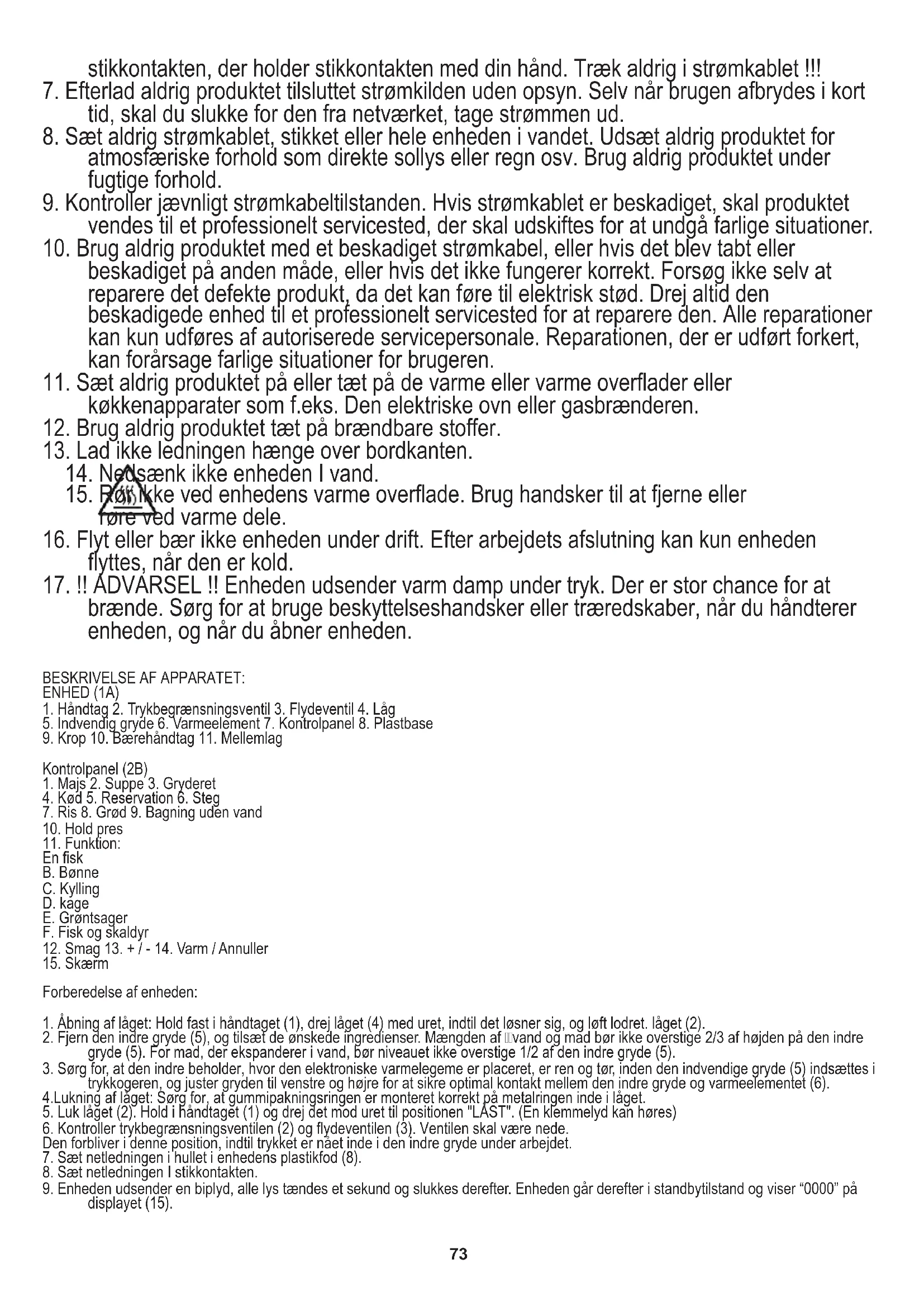 17. !! ADVARSEL !! Enheden udsender varm damp under tryk. Der er stor chance for at