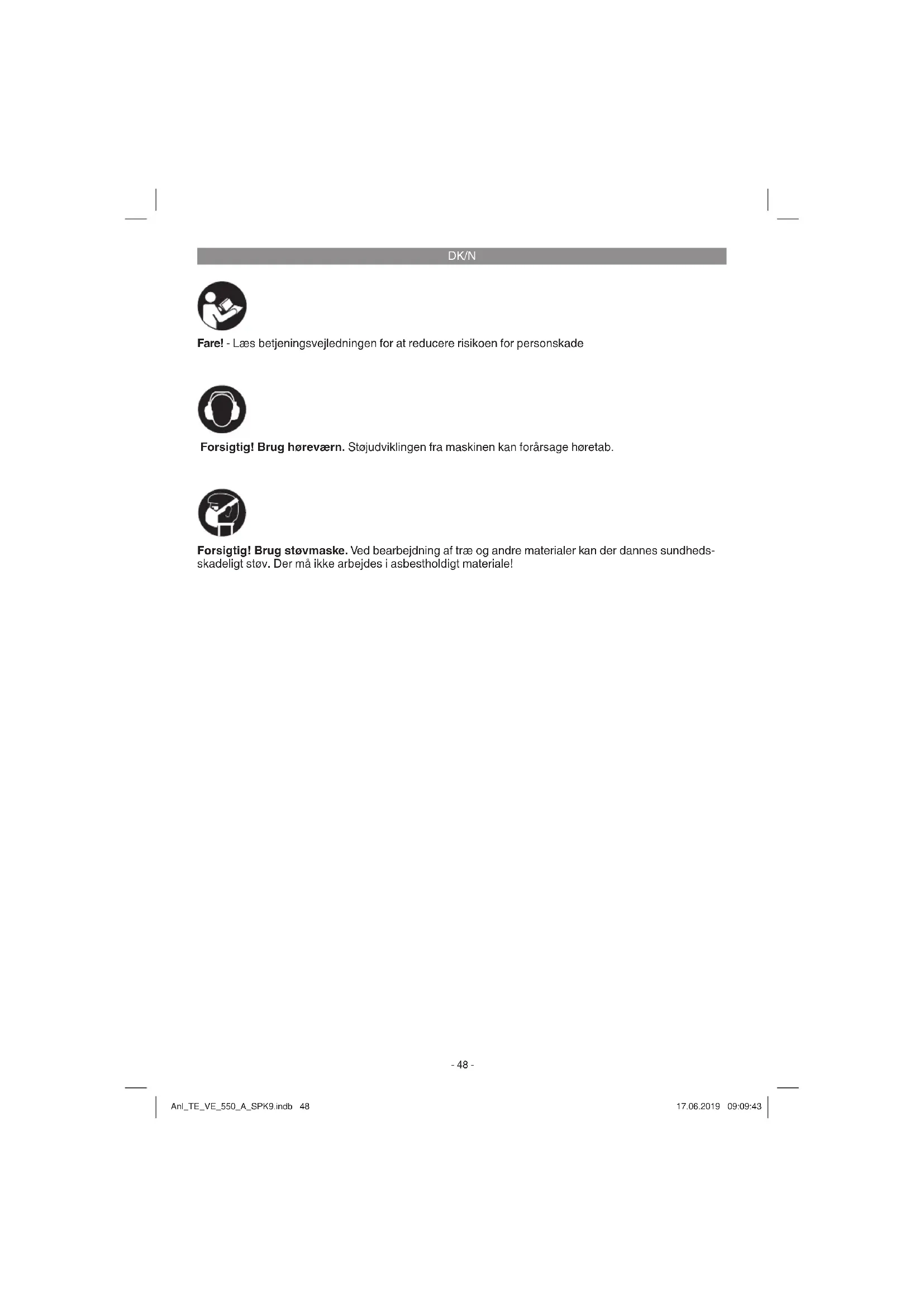 Fare! - Læs betjeningsvejledningen for at reducere risikoen for personskade Forsigtig! Brug høreværn. Støjudviklingen fra maskinen kan forårsage høretab. Forsigtig! Brug støvmaske. Ved bearbejdning af træ og andre materialer kan der dannes sundheds- skadeligt støv. Der må ikke arbejdes i asbestholdigt materiale! Anl_TE_VE_550_A_SPK9.indb 48Anl_TE_VE_550_A_SPK9.indb 48 17.06.2019 09:09:4317.06.2019 09:09:43DK/N