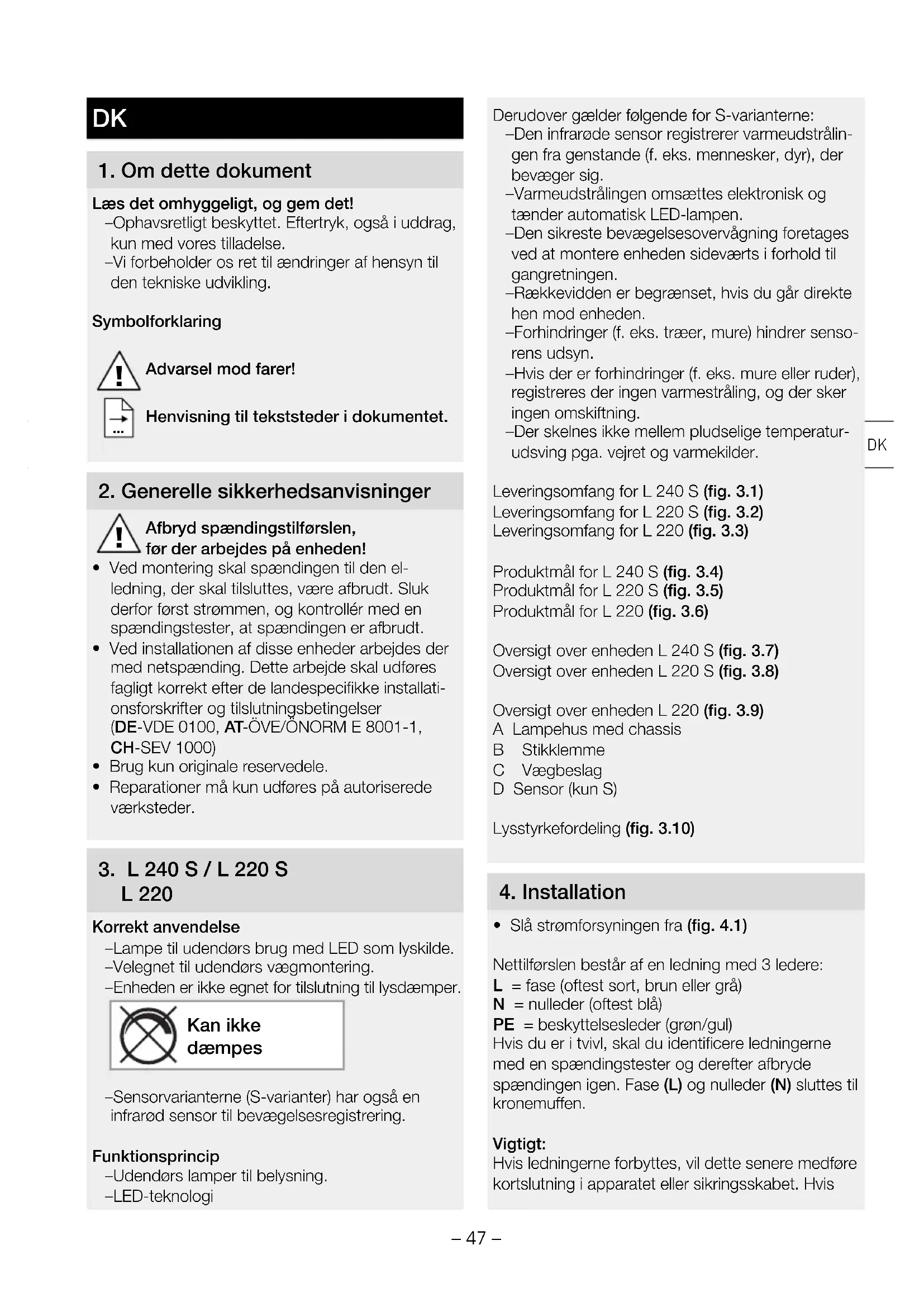 L 220 Korrekt anvendelse – Lampe til udendørs brug med LED som lyskilde. – Velegnet til udendørs vægmontering. – Enheden er ikke egnet for tilslutning til lysdæmper. Kan ikke dæmpes – Sensorvarianterne (S-varianter) har også en infrarød sensor til bevægelsesregistrering. Funktionsprincip – Udendørs lamper til belysning. – LED-teknologi Derudover gælder følgende for S-varianterne: – Den infrarøde sensor registrerer varmeudstrålin- gen fra genstande (f.eks. mennesker, dyr), der bevæger sig. – Varmeudstrålingen omsættes elektronisk og tænder automatisk LED-lampen. – Den sikreste bevægelsesovervågning foretages ved at montere enheden sideværts i forhold til gangretningen. – Rækkevidden er begrænset, hvis du går direkte hen mod enheden. – Forhindringer (f.eks. træer, mure) hindrer senso- rens udsyn. – Hvis der er forhindringer (f.eks. mure eller ruder), registreres der ingen varmestråling, og der sker ingen omskiftning. – Der skelnes ikke mellem pludselige temperatur- udsving pga. vejret og varmekilder. Leveringsomfang for L 240 S (fig. 3.1) Leveringsomfang for L 220 S (fig. 3.2) Leveringsomfang for L 220 (fig. 3.3) Produktmål for L 240 S (fig. 3.4) Produktmål for L 220 S (fig. 3.5) Produktmål for L 220 (fig. 3.6) Oversigt over enheden L 240 S (fig. 3.7) Oversigt over enheden L 220 S (fig. 3.8) Oversigt over enheden L 220 (fig. 3.9) A Lampehus med chassis B Stikklemme C Vægbeslag D Sensor (kun S) Lysstyrkefordeling (fig. 3.10)