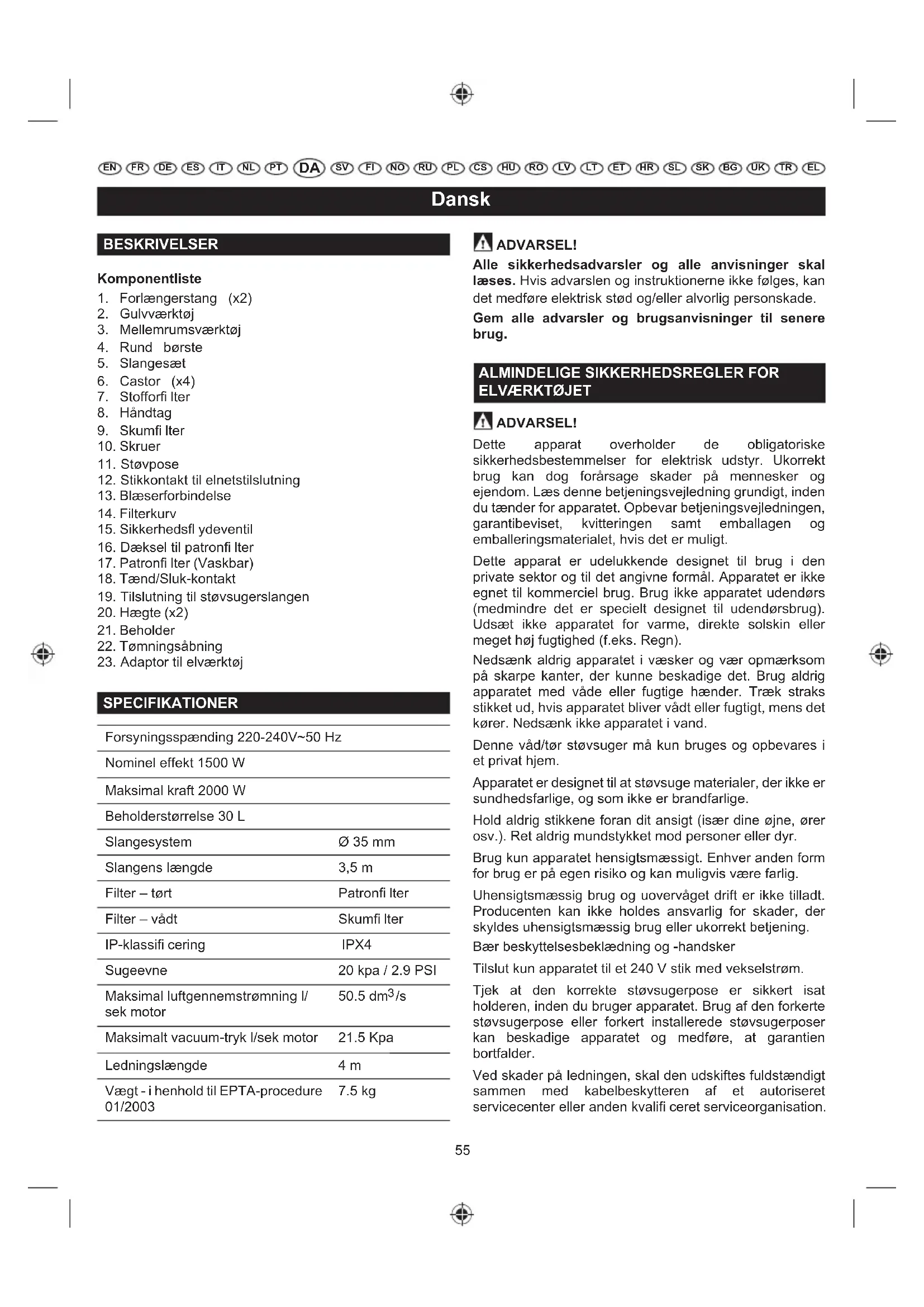 EN FR DE ES IT NL PT SV FI NO RU PL CS HU RO LV LT ET HR SL SK UKBG TR EL kabel for at forhindre enhver risiko for elektrisk stød og personskade. Brug kun originalt tilbehør og reservedele. Ikke godkendte dele eller tilbehør fra tredjepart kan være en mulig kilde til fare og medfører, at garantien bortfalder. Tjek ofte fl ydeventilen. Hvis der løber væske ud fra støvsugeren, skal du straks slukke for den og trække ledningen ud. Nedsænk ikke støvsugeren i vand. Pas på ikke at spilde vand på apparatet. Når du bortskaffer spildevand, skal du sørge for at overholde alle gældende lovbestemmelser. Opbevar kun apparatet et sikkert og tørt sted uden for børns rækkevidde. Læs også grundigt de følgende "særlige sikkerhedsregler". Dette produkt er ikke beregnet til at blive brugt eller rengjort af personer med nedsatte fysiske, sensoriske eller mentale evner, eller med manglende erfaring eller viden, med mindre disse personer er blevet instrueret i sikker brug af produktet af en person, der er juridisk ansvarlig for disse personers sikkerhed. De skal være under opsyn, så længe de benytter produktet. Børn må hverken benytte, rengøre eller lege med dette produkt, som - når det ikke benyttes - skal opbevares utilgængeligt for børn. Børn bør holdes under opsyn, så man er sikker på, at de ikke leger med produktet. Hvis strømledningen er beskadiget, skal den udskiftes af producenten, serviceagenten eller en lignende kvalifi ceret person, så man kan undgå fare. Elektrisk strøm skal leveres via en fejlstrømsafbryder (RCD), der kobler ud ved 30 mA. Brug kun en vejrbestandig forlængerledning. Kontroller forlængerledningen for beskadigelse før hver brug. Rul altid forlængerledningen ud under brug, fordi opviklede kabler kan blive overophedet. Beskadigede forlængerledninger bør ikke repareres. De bør udskiftes med en tilsvarende type. VED BRUG AF BLÆSERFUNKTIONEN: Ret kun luftudledning mod arbejdsområdet - aldrig mod mennesker eller dyr. Brug ikke blæserem som sprøjte i våd tilstand. Bær en støvmaske og beskyttelsesbriller. ADVARSEL Sluk altid for maskinen og tag stikket ud af stikkontakten Støvsug ikke aske, varmt kul og lignende, store glasskår og skarpe ting. Støvsug ikke tonerstøv, der f.eks. anvendes i printere og kopimaskiner, fordi det er elektrisk ledende. Derudover er det muligt, at det ikke fi ltreres fuldstændigt fra af våd/ tør støvsugerens fi ltersystem og kan udledes i luften via udsugningsventilatoren. Støvsug aldrig brandfarlige væsker som f.eks. petroleum, olie, syre eller andre fl ygtige stoffer. Støvsug ikke væsker, der er varmere end 60° C, eller giftigt eller brandfarligt støv. Lad aldrig apparatet ligge på siden. Vær særlig opmærksom på at apparatet holdes i en vandret position og tilstrækkeligt stabilt på trapper. Sørg for at stikket er trukket ud af stikkontakten inden rengøring eller udskiftning af fi ltrene eller tilbehør. Kun autoriserede fagmænd må foretage reparationer på elektrisk udstyr. Ukorrekt reparation kan medføre betydelig fare for brugeren. Opbevar ikke apparatet direkte ved siden af en varm ovn eller radiator. Børn, handicappede og ældre er ofte ikke opmærksomme på farerne ved håndtering af elektriske apparater. Ovennævnte og uuddannede personer må aldrig arbejde med dette elektriske apparat. Sluk altid for apparatet, ved rengøring eller fl ytning. Lad aldrig støvsugeren være slået til en stikkontakt, når du ikke bruger den i en længere periode. Hiv aldrig i ledningen, men tag fat om selve stikket, når du tager det ud af stikkontakten. Fjern også specielt tilbehør fra apparatet. Sørg for at støvsugeren altid holdes ren. Brug ikke opløsningsmidler eller rengøringsmidler, der kan beskadige eller være skadelige for apparatet eller brugeren. Lad aldrig apparatet være tændt uden opsyn. Hvis du forlader arbejdsområdet, skal du slukke for apparatet eller tage det ud af stikkontakten (træk ikke i ledningen, men tag fat om stikket). For at beskytte børn mod elektriske husholdningsapparater skal du sørge for, at kablet ikke er lagt således, at børn kan snuble over det, og at børn ikke har adgang til selve apparatet. Brug aldrig apparatet, når du er under indfl ydelse af medicin, alkohol eller stoffer, hvis du for øjeblikket er under lægebehandling, eller hvis du er træt. Tjek jævnligt støvsugeren og ledningen for skader. Benyt aldrig apparater, hvis de er beskadigede. Du må aldrig selv reparere støvsugeren. Overlad altid reparationer til en autoriseret fagmand. Lad altid defekte netledninger udskiftes straks af producenten eller en autoriseret serviceorganisation. Brug den samme type57 Dansk