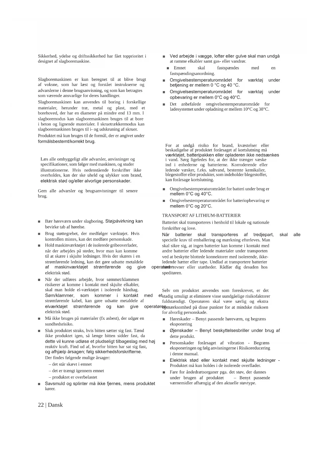 Slagboremaskinen er kun beregnet til at blive brugt af voksne, som har læst og forstået instrukserne og advarslerne i denne brugsanvisning, og som kan betragtes som værende ansvarlige for deres handlinger. Slagboremaskinen kan anvendes til boring i forskellige materialer, herunder træ, metal og plast, med et borehoved, der har en diameter på mindre end 13 mm. I slagboremodus kan slagboremaskinen bruges til at bore i beton og lignende materialer. I skruetrækkermodus kan slagboremaskinen bruges til i- og udskruning af skruer. Produktet må kun bruges til de formål, der er angivet under IRUPnOVEHVWHPWNRUUHNWEUXJ ADVARSEL Læs alle omhyggeligt alle advarsler, anvisninger og specifikationer, som følger med maskinen, og studer illustrationerne. Hvis nedenstående forskrifter ikke overholdes, kan der ske uheld og ulykker som brand, HOHNWULVNVW¡GRJHOOHUDOYRUOLJHSHUVRQVNDGHU Gem alle advarsler og brugsanvisninger til senere brug. SIKKERHEDSADVARSLER VEDR. SLAGBOREMASKINE Ŷ Bær høreværn under slagboring. 6W¡MSnYLUNQLQJNDQ bevirke tab af hørelse. Ŷ Brug støttegrebet, der medfølger værktøjet. Hvis kontrollen mistes, kan det medføre personskade. Ŷ Hold maskinværktøjet i de isolerede gribeoverlader, når der arbejdes på steder, hvor man kan komme til at skære i skjulte ledninger. Hvis der skæres i en strømførende ledning, kan det gøre udsatte metaldele DI PDVNLQYUNW¡MHW VWU¡PI¡UHQGH RJ JLYH RSHUDW¡UHQ elektrisk stød. Ŷ Når der udføres arbejde, hvor sømmet/klammen risikerer at komme i kontakt med skjulte elkabler, skal man holde el-værktøjet i isolerede håndtag. 6¡PNODPPHU VRP NRPPHU L NRQWDNW PHG HW strømførende kabel, kan gøre udsatte metaldele af HOYUNW¡MHW VWU¡PI¡UHQGH RJ NDQ JLYH RSHUDW¡UHQ elektrisk stød. Ŷ Må ikke bruges på materialer (fx asbest), der udgør en sundhedsrisiko. Ŷ Sluk produktet straks, hvis bitten sætter sig fast. Tænd ikke produktet igen, så længe bitten sidder fast, da